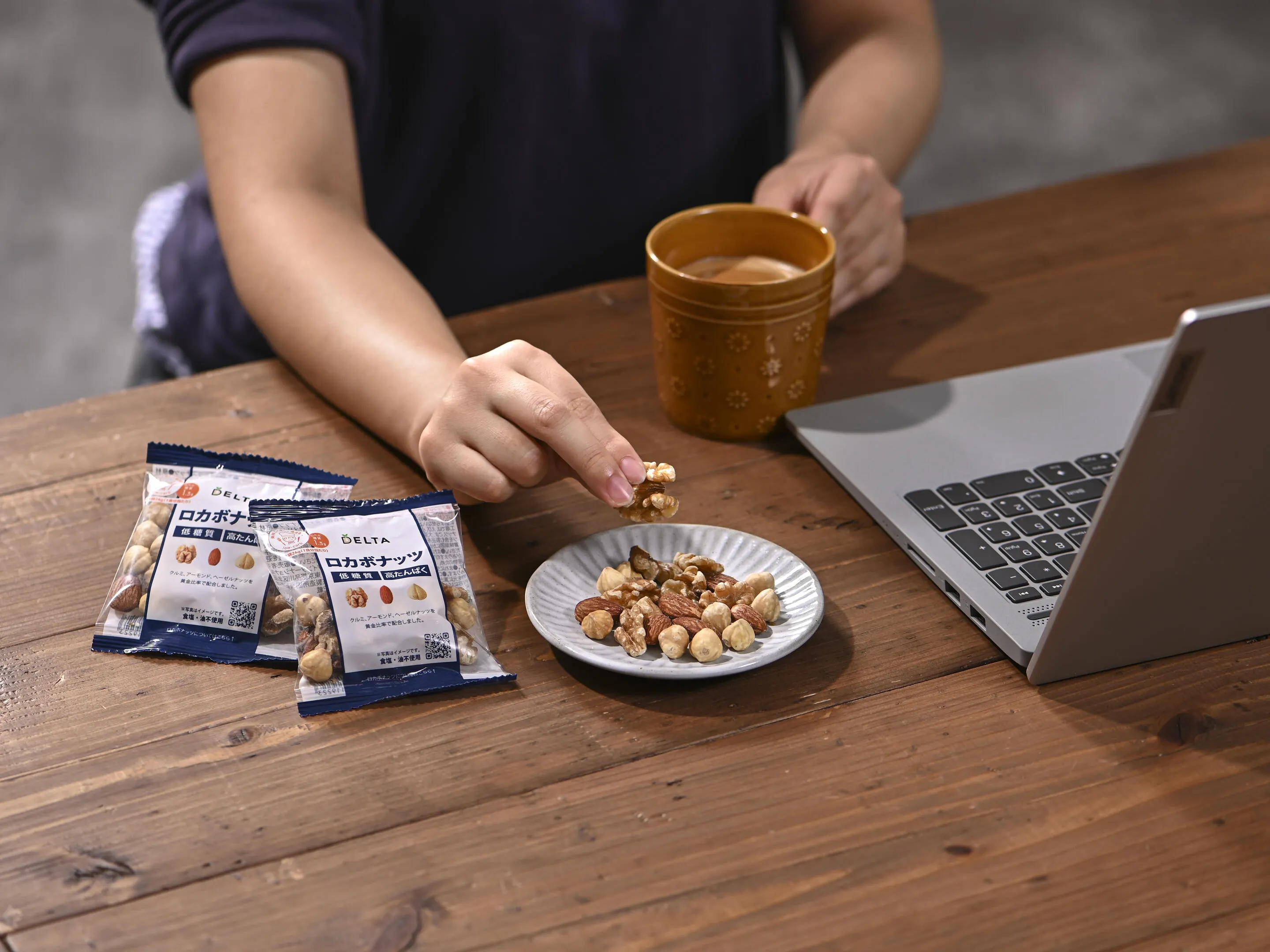 デルタのロカボナッツは、パートナーとして同じ目標をもったサステイナブルな(持続可能な)農園経営を行っている契約農園から採れるナッツを使用し、100年以上の歴史を持つ老舗でロースト。素焼きだから、毎日食べても飽きが来ないおいしさ。24gの食べきりサイズで、無理せず楽しく続けられます。