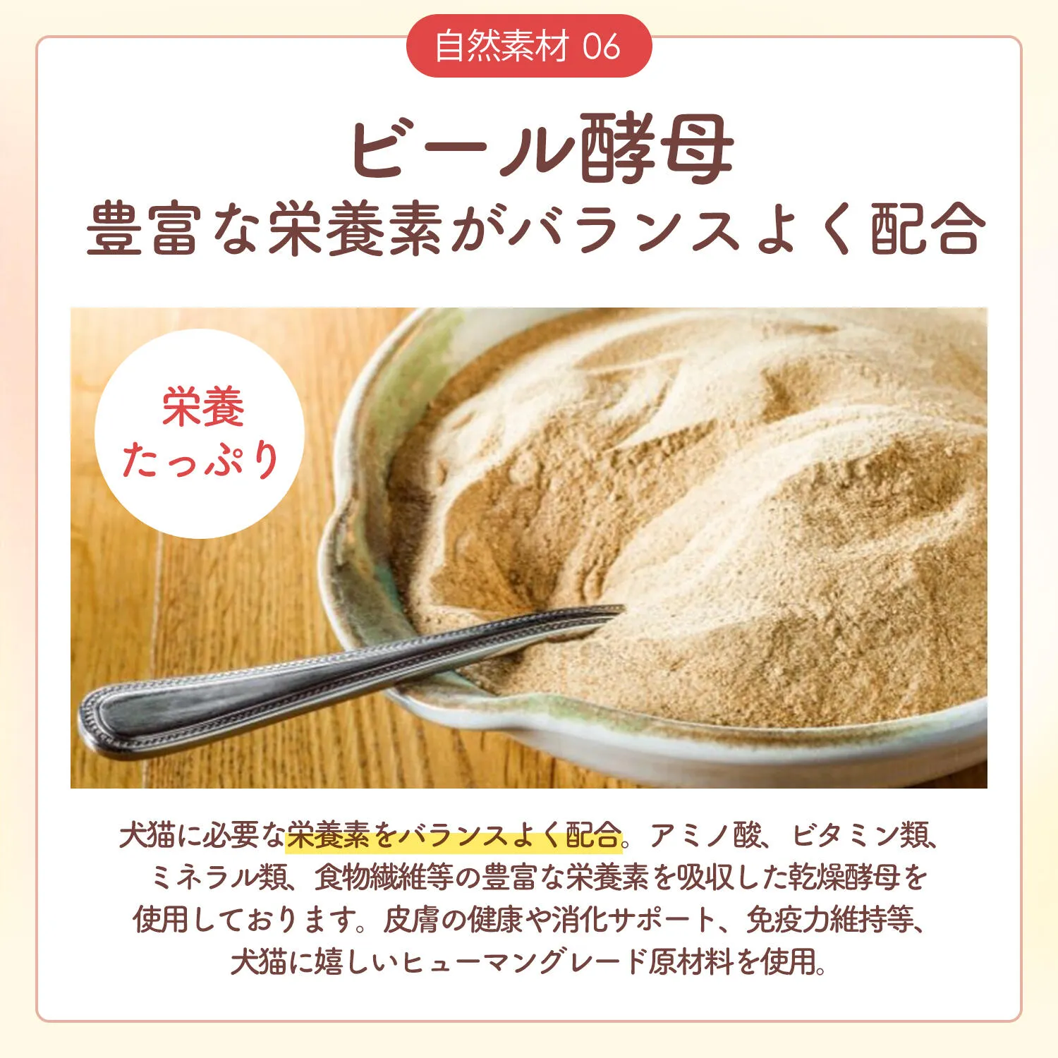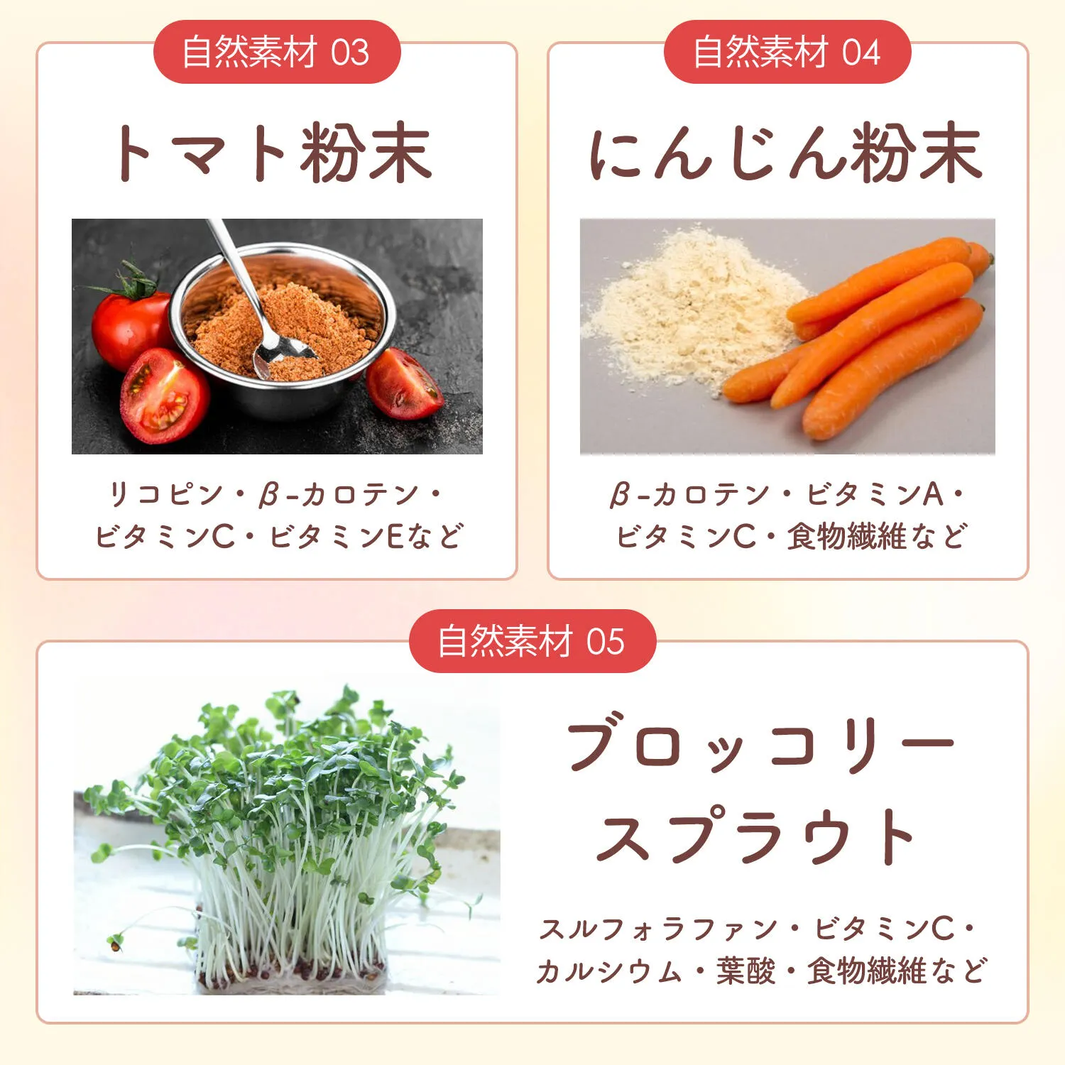 そして、7種類の栄養成分の絶妙なバランス。カツオエキス、フラクトオリゴ糖、ニンジン粉末、トマトパウダー、発芽ブロッコリーなど、すべて天然由来の原材料を使用。