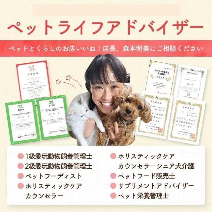 ペットの健やかな毎日を願って―― 8種の専門資格を持つペットライフアドバイザー森本明美です。 日々犬猫の健康と真摯に向き合い、食事や生活習慣、心のケアまで幅広くサポートしてきました。 その経験を活かし、愛犬・愛猫の体に優しく、毎日続けやすいオリジナルサプリメントを独自に開発。安心・安全な素材にこだわり、ペットが本来持つ自然な力を引き出すことを目指しています。 「すべてのペットとその家族が、笑顔あふれる毎日を送れるように」 そんな思いを胸に、一つ一つの商品を丁寧にお届けしています。
