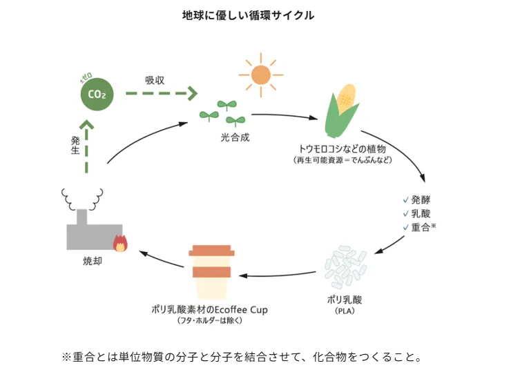 カップ本体の素材を従来のバンブーファイバー(竹の繊維)等から、植物由来バイオプラスチックの一種「ポリ乳酸(PLA)」へと変更。ポリ乳酸は甜菜(てんさい)、トウモロコシ、サトウキビなどのでんぷんを原料とするバイオポリマーで、石油由来のプラスチックとは異なり、カーボンニュートラルなエコ素材として注目を集めています。