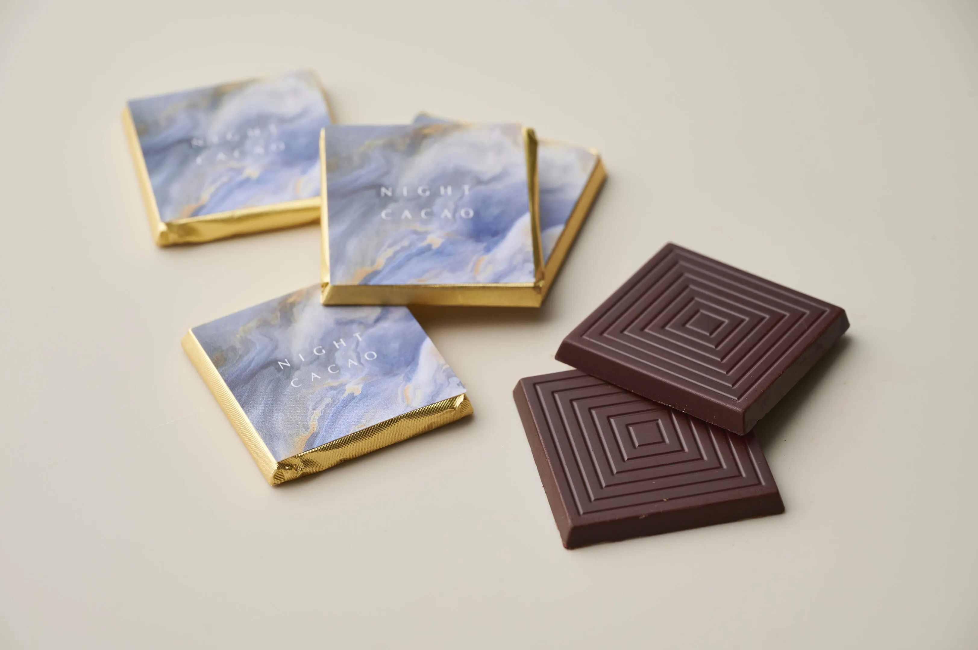 一口タイプの板チョコレート。食事の前に食べるとドカ食いを防ぐ効果もあります。食後のウイスキーやワインなどのおつまみにも。エステサロンの施術後にも。