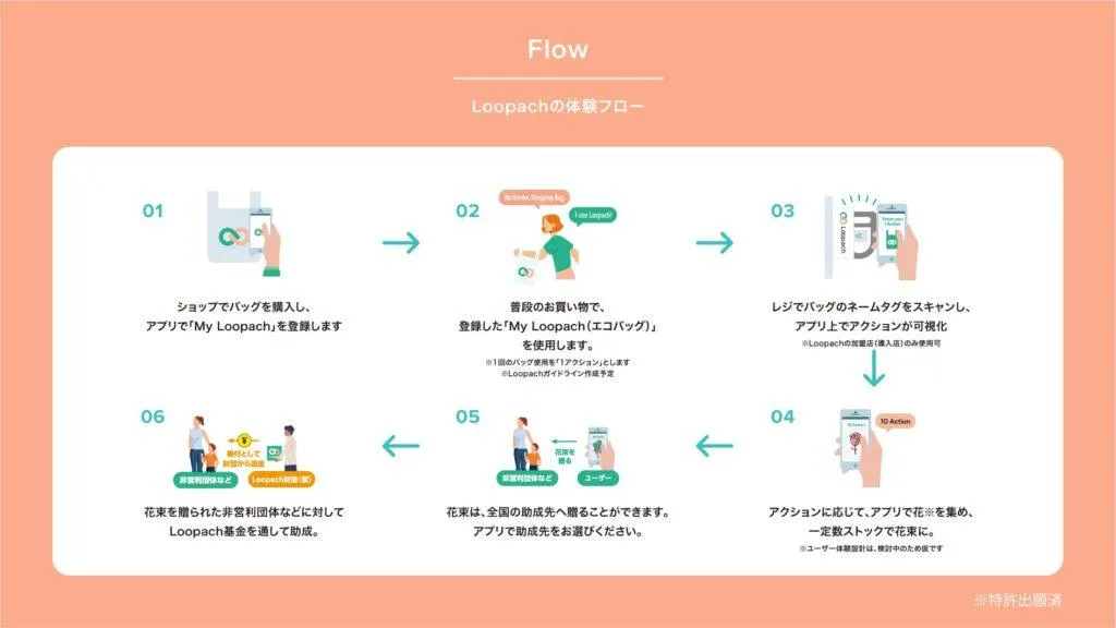 ユーザーはアプリを保有して「My Loopach」を管理し、レジ袋等を断るという日常のアクションを可視化します。日々のアクションによってポイントが加算され、溜まったポイントを市民活動団体に寄付が可能です。