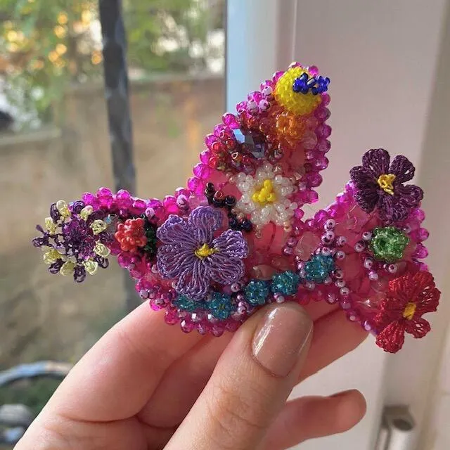 幼少のころから伝統刺繍をみながら、みようみまねで様々な製作活動をしているうちに、自分のやり方が確立し、自宅工房でさまざまな作品をつくりました。人々の顔や胸のまわりを華やかなお花のアートにしていくのが好きです。