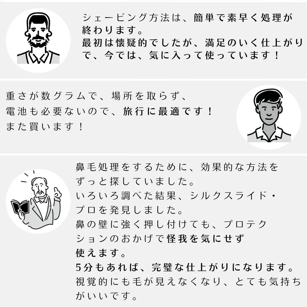 Silkslide Proは、肌にやさしく、やわらかな剃り味の鼻毛カッターです。