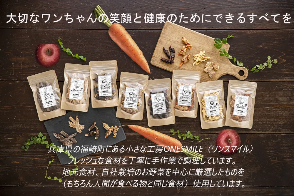 ONESMILEブランドで多種多様なペットフードを製造しています。 直売店舗でお客様のお声を聴きながら、商品開発を行っており、様々なニーズのお応えいただける商品ラインナップとなっています。 弊社では、ペットフード販売士とペット栄養管理士や愛犬家のスタッフが在籍しており、みんなで楽しみながらお客様にいいものをお届けできるように作っています。 また、兵庫県立大学との共同開発でドッグフードを作成しています。 契約農家様から素晴らしい生産物を提供して頂き皆さんに最高のペットフードを提供できております。