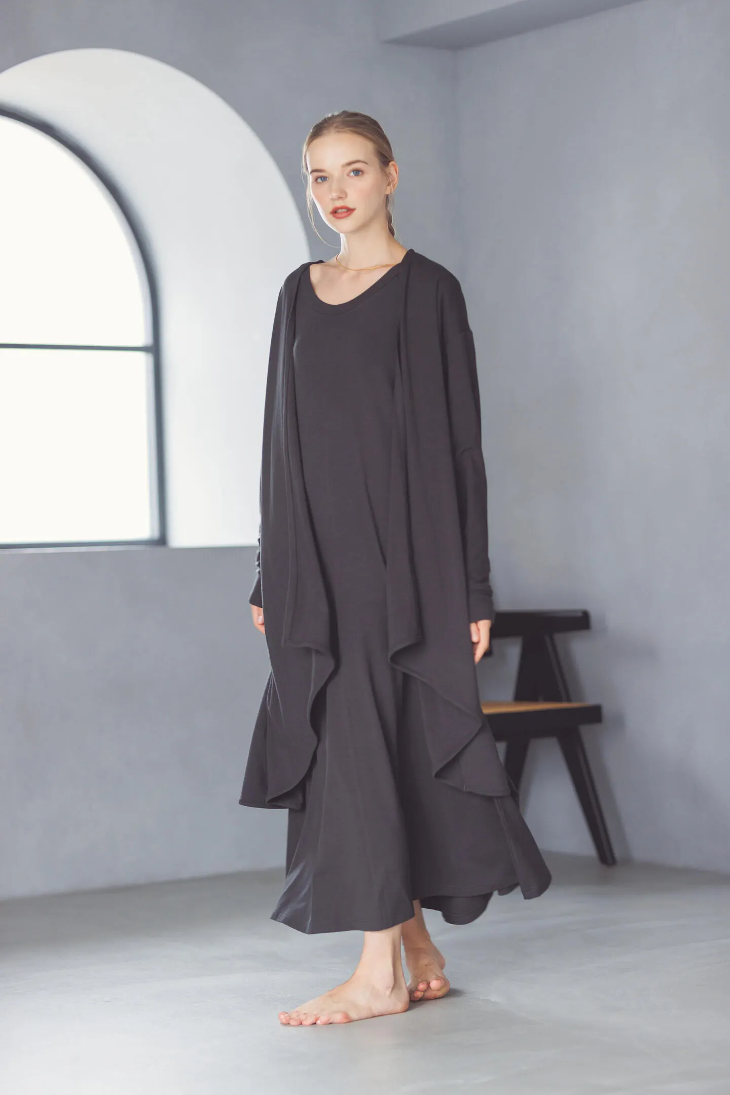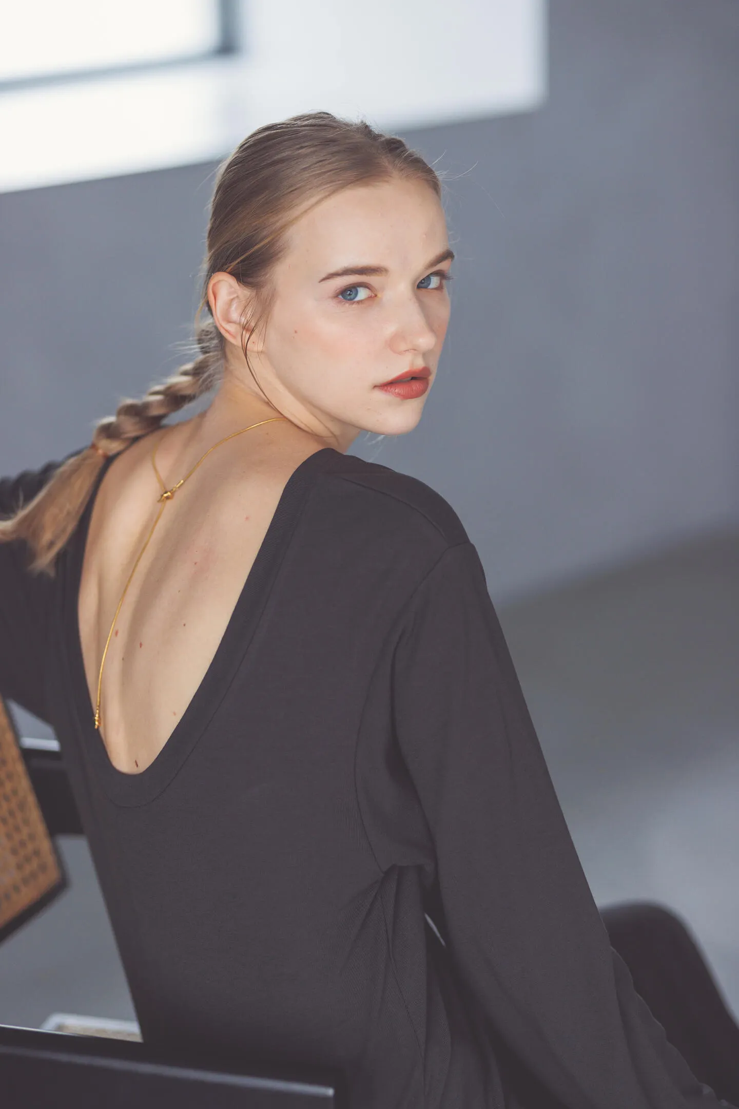 着心地の良さと同時に、見た目の美しさも重視。体のラインを拾いすぎず、それでいてだらしなく見えない、絶妙なシルエットを設計。動いたときに自然と生まれる上品なドレープ感もポイントです。