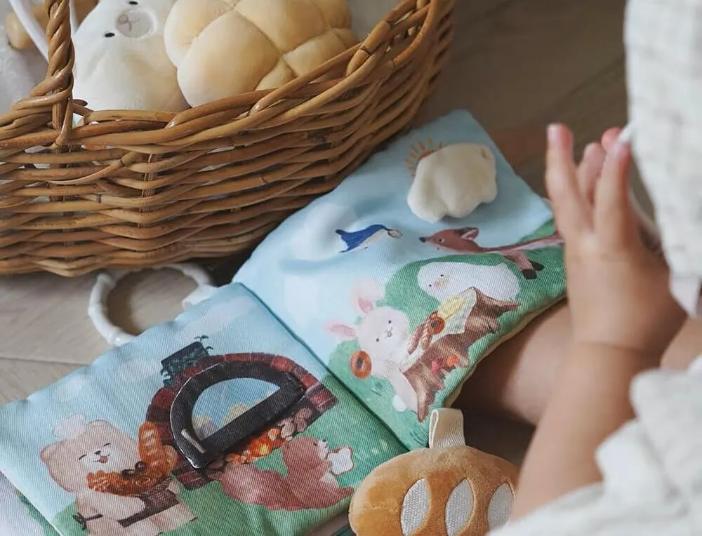 ページをめくるたびに「カシャカシャ」「ふわふわ」などの感触が楽しく、赤ちゃんの“もっと触りたい”を引き出します。