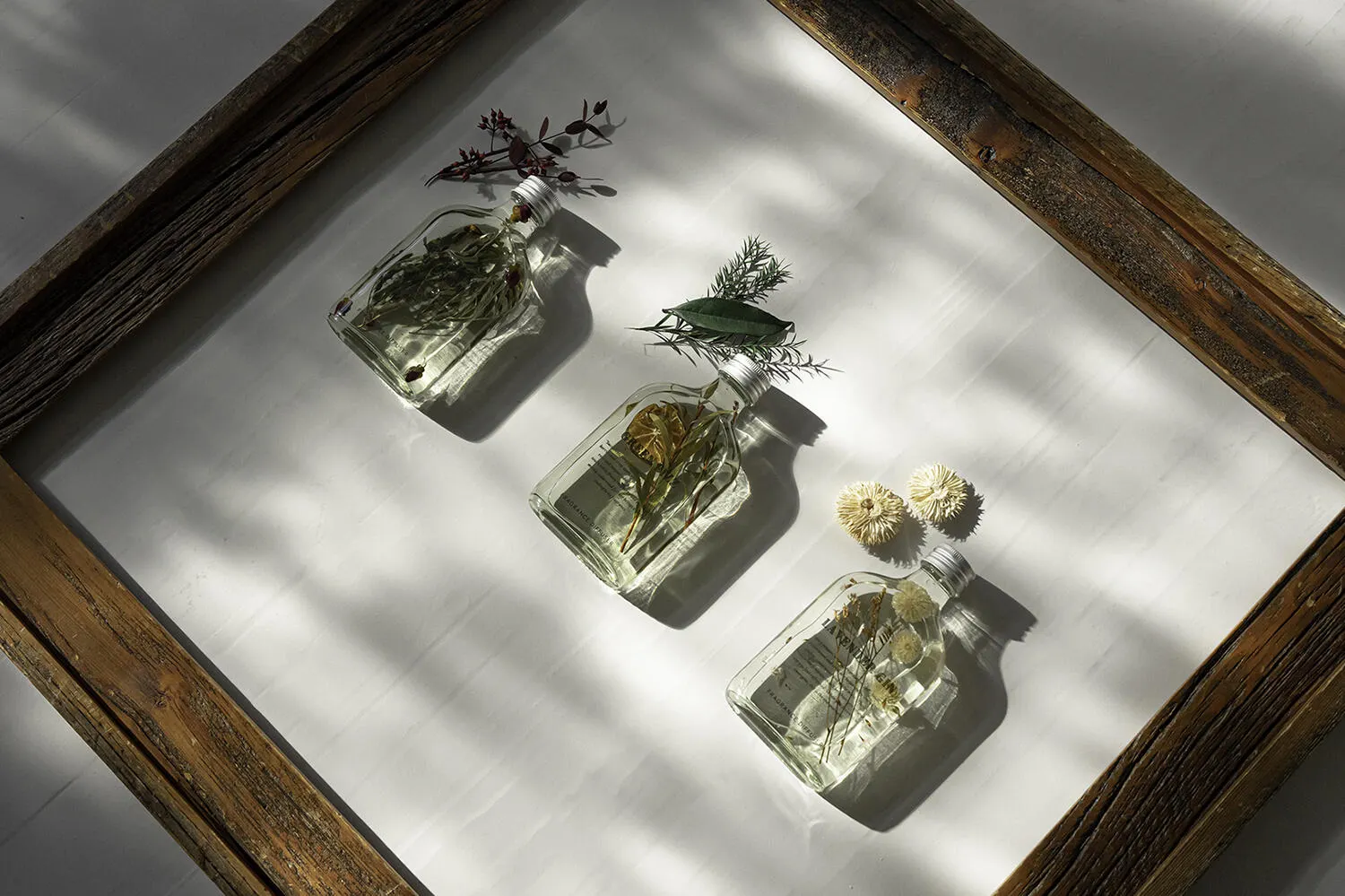 ドライフラワーをボトルに閉じ込め、見た目にも美しく、インテリアとしても楽しめるディフューザー。