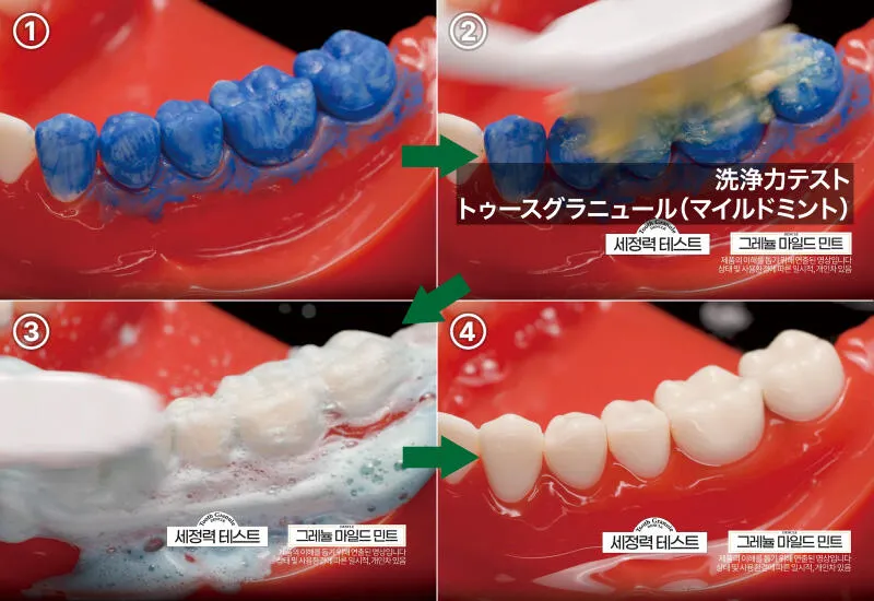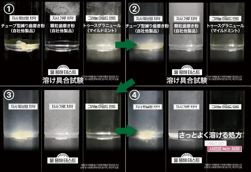ペーストの歯みがき粉に使われる水分や、製剤維持のための不要な化学成分を一切入れず、お口の環境に良い成分をできるだけ多く含ませるためグラニュール製剤が開発されました。口の中で溶けにくい粉状のパウダー製剤ではなく、微細な粉を卵が束ねる工法で作られたグラニュールは、効果的な成分をカプセル化して保護し、口の中で素早く溶けます。