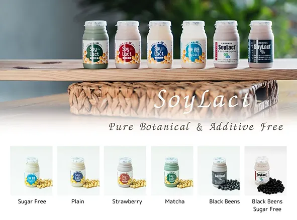 大手メーカー様に先駆けてドリンクタイプの豆乳ヨーグルトの開発を、福岡県工業技術センター生物食品研究所との共同研究で実施しました。乳酸菌発酵は通常乳酸菌が糖を食べて増えていくものですが、糖を加えずに乳酸菌発酵を完了する技術を確立しました。結果として大豆製品に含まれる配糖体イソフラボン(グリコシド型)に結合した糖質を乳酸菌が食べてしまうことで体内で吸収され易い無配糖体イソフラボン(アグリコン型)の比率が逆転して、イソフラボン全体の65%まで上昇したことで、経年による女性特有のトラブルを緩和し易い商品となっています。(特許第6461229号福岡県共同出願)
