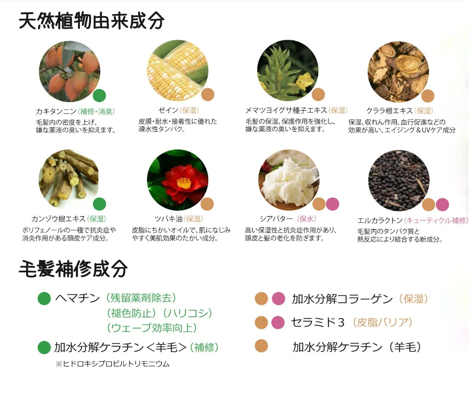 パーマ&カラーの長持ち成分「ヘマチン」、ダメージケア成分「カチオン化コラーゲンPPT」を業界最高峰レベルの濃度で配合しています。