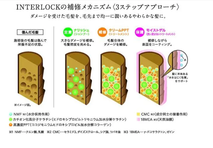 インターロックシリーズは、美容院の業務用で15年以上使用されているカラー・パーマ後のプロフェッショナルなシャンプー&トリートメントです。数度のリニューアルを行い、現在は13種類の天然植物由来成分と毛髪補修成分を配合しています。