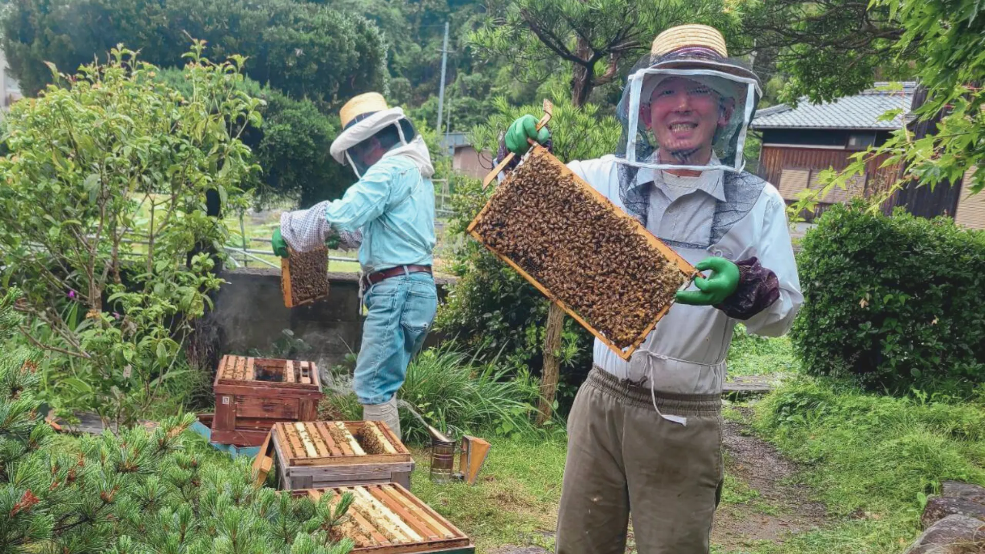 岡山で養蜂を一から学びながら、採蜜をしているところ。