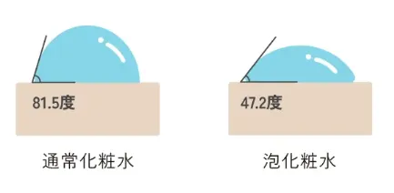 右の泡化粧水の方が接触角度が小さく、お肌への設置面が広く、より※浸透していることが分かります。更に、設置面が広いため、よりムラなくお肌への塗布が可能です。