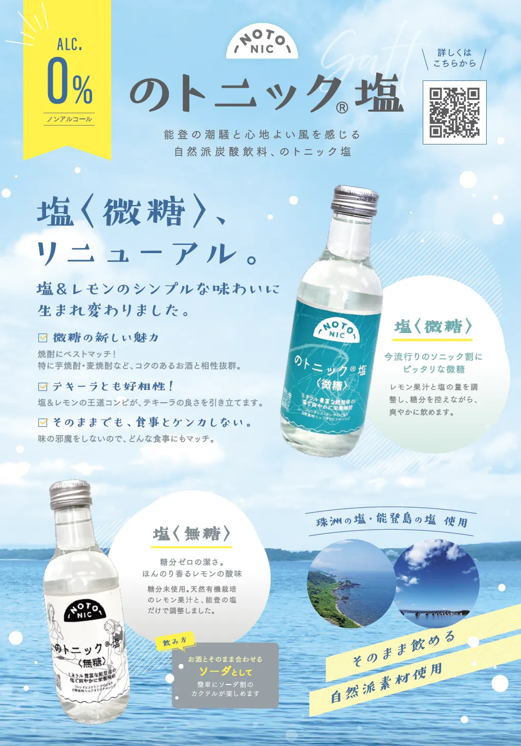 「のトニック塩」シリーズは、珠洲と能登島の粗塩を使用した、他にはない独特な炭酸飲料です。果糖ぶどう糖液糖不使用で自然な味わいを実現し、微糖タイプと無糖タイプをご用意しています。のとジンとの相性も抜群で、能登の海の恵みを感じられる特別なトニックウォーターとしてご愛用いただいています。