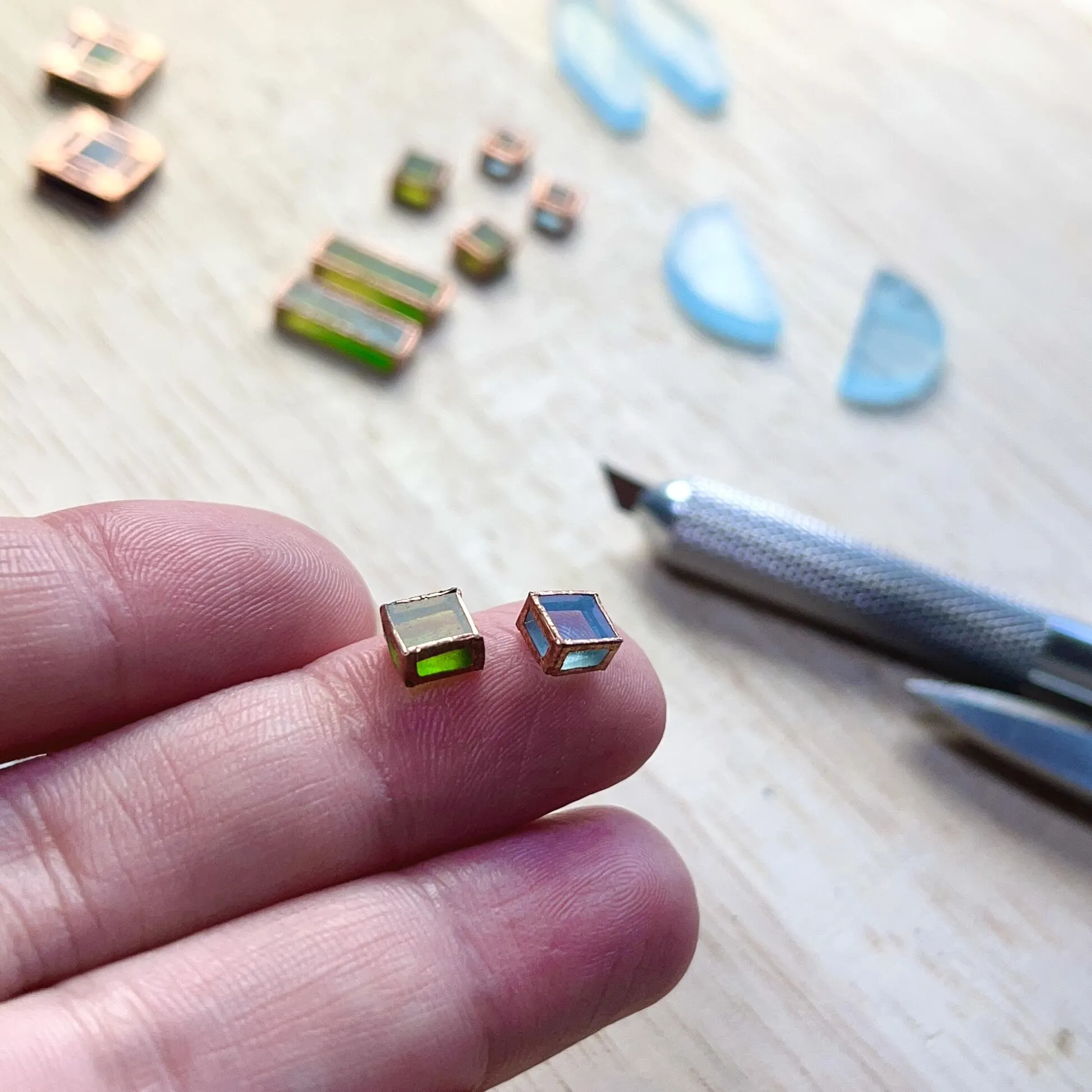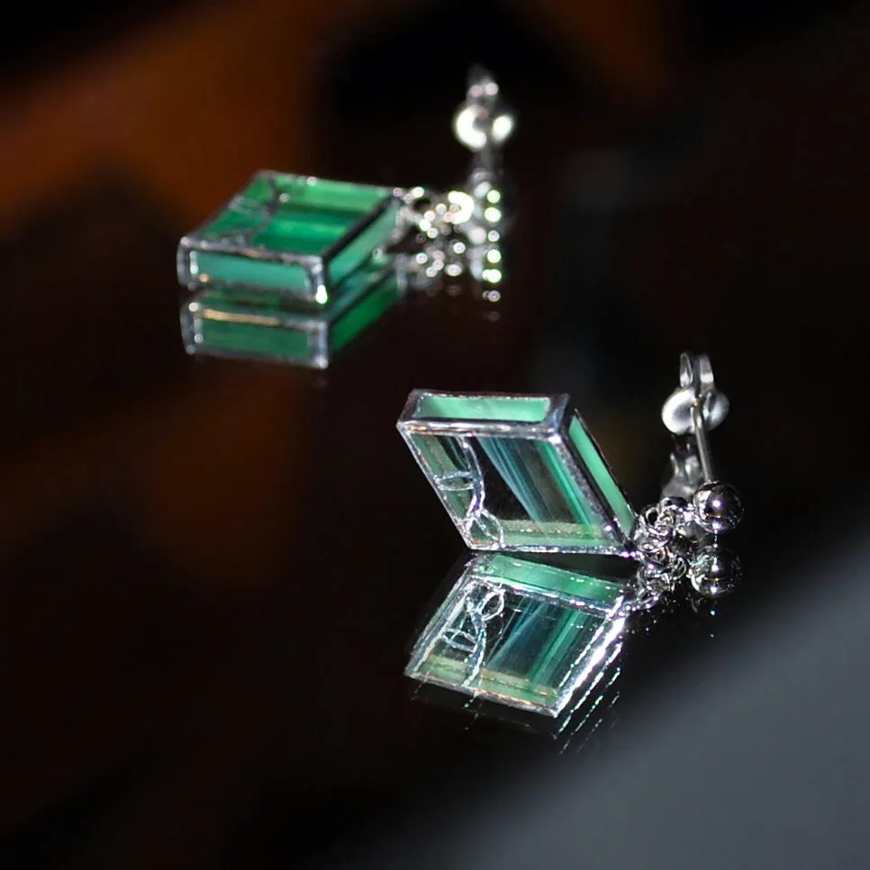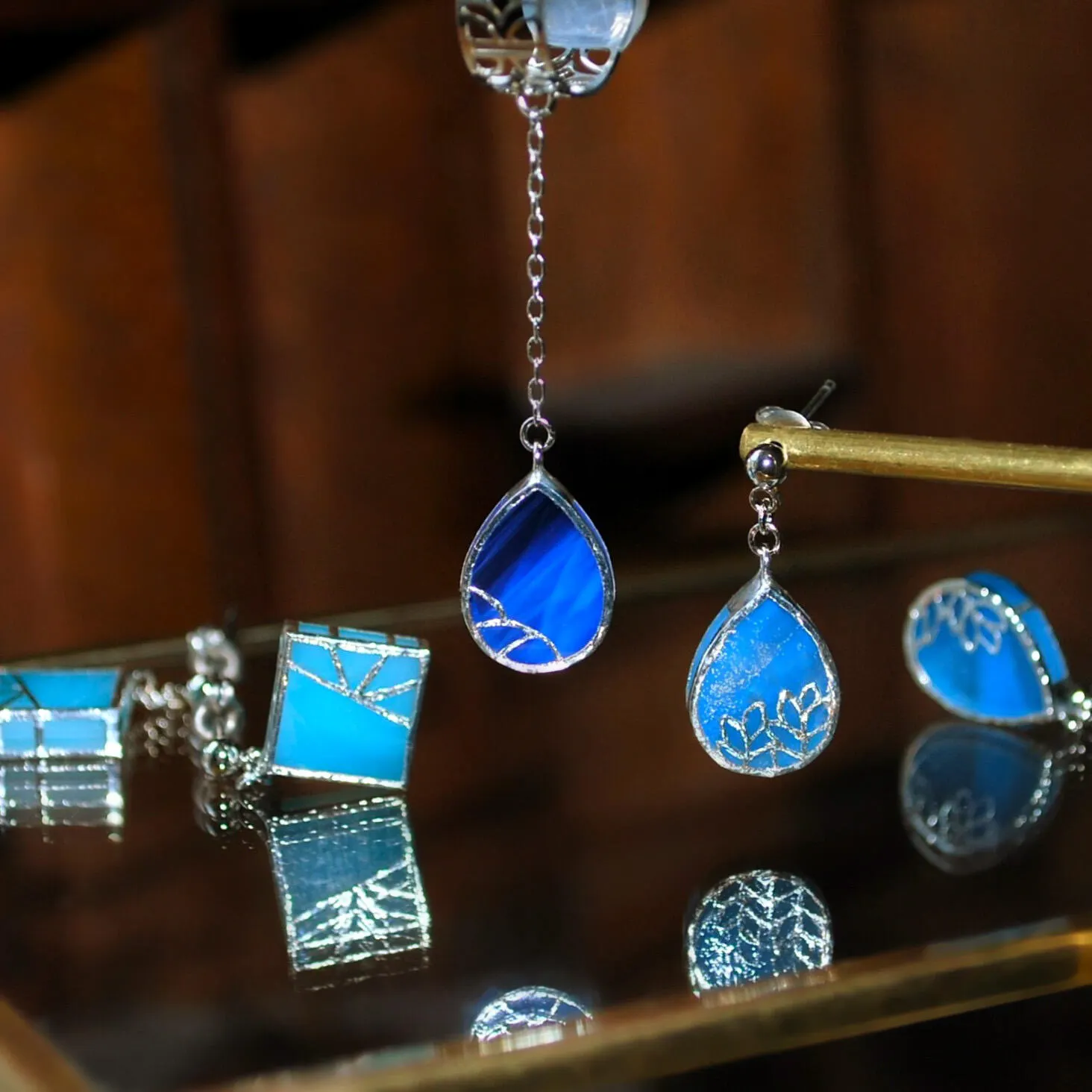 大きな板ガラスから1つずつ手作業でカットして製作しているため、色味や厚さが全て異なります。同じガラスを使っても2度と同じものは生まれない、世界に1つだけのジュエリーです。