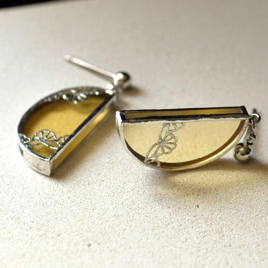大きな板ガラスから小さなパーツを手作業で切り出し、1つ1つハンダ付けした、全て表情の異なる世界に1つだけのジュエリーです。