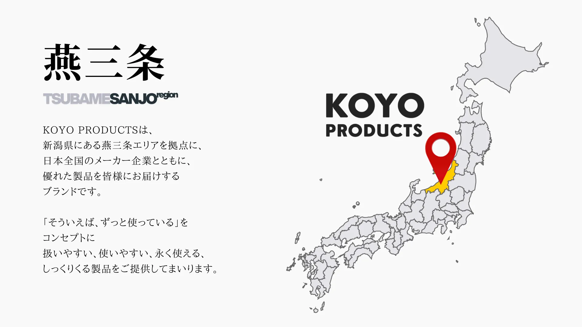全国各地のメーカーの皆様に私たちのブランドであるKOYO PRODUCTSのオリジナル製品を作っていただき、販売しています。