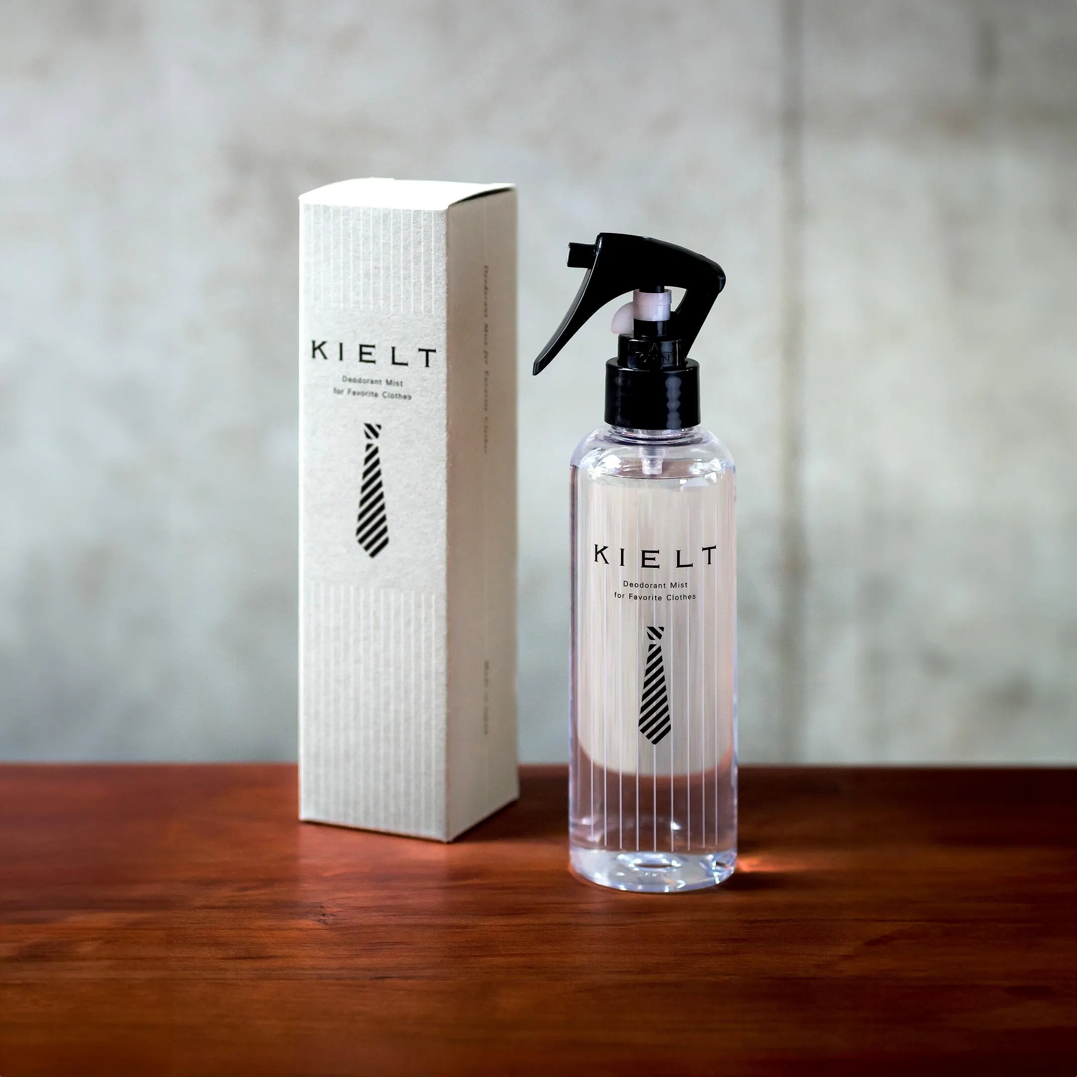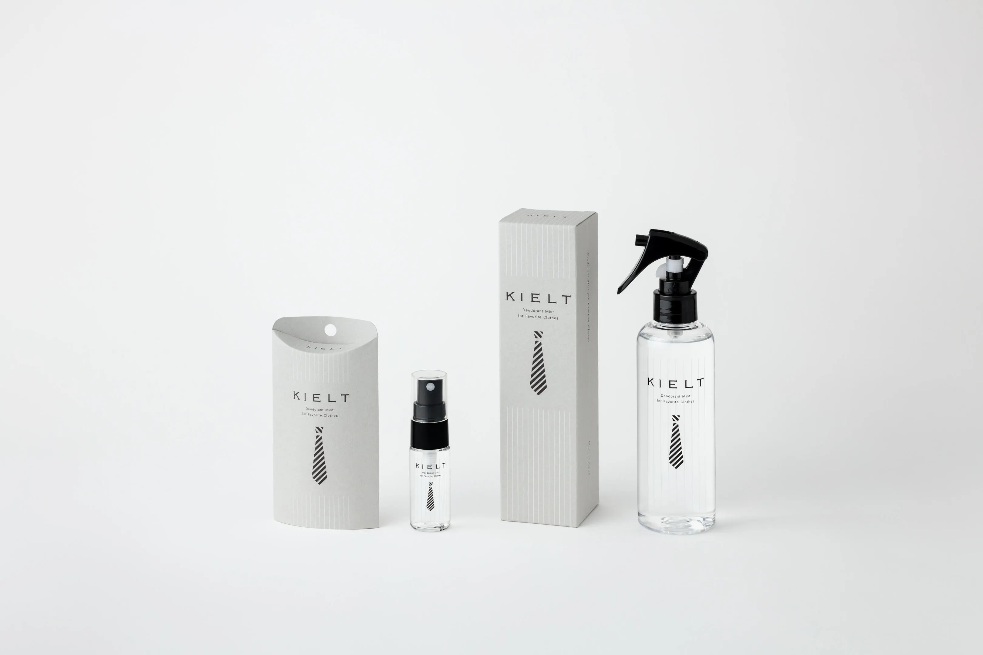 KIELTの製品は、ミニマルで洗練されたデザインと、使う人の心地よさを徹底的に追求した機能性が特徴です。主力商品である「オウダーリムーバー」は、スーツやジャケットの生地を傷めず、汗やタバコなどの不快なニオイを元から分解する天然植物抽出エキスを配合。無香料であるため、香りでごまかすことなく、装い本来の清潔感を保ちます。200mLの通常サイズに加え、持ち運びに便利な20mLのミニサイズを展開。外出先や出張時にもスマートに使える点が高く評価されています。