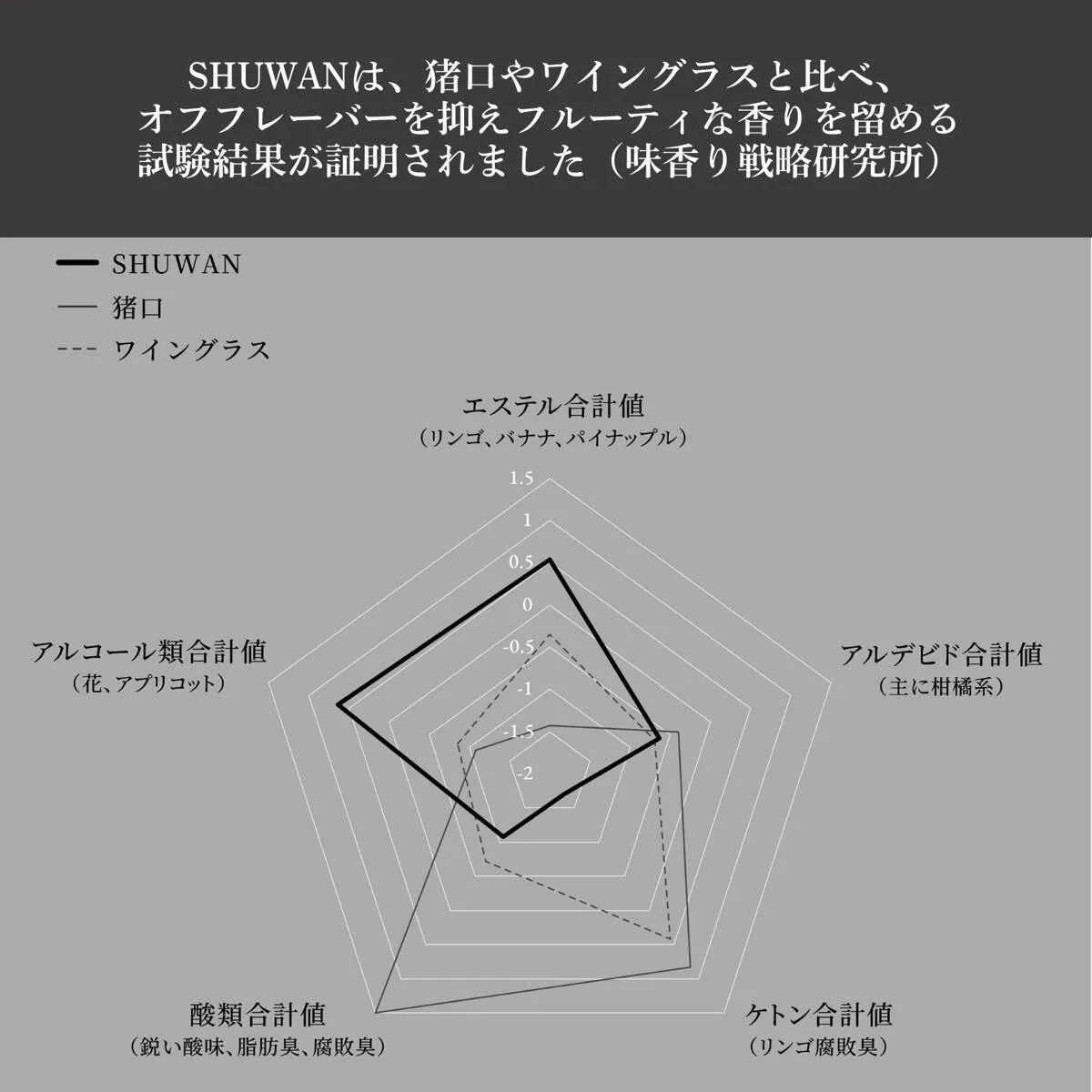 実際の測定結果では、SHUWANは猪口やワイングラスと比較して、リンゴやバナナといったフルーツ系の成分量が多く、不快な臭い成分が少ないことが科学的に証明されています。この特別な形状により、質量の軽い不快な臭い成分は程よく放散され、フルーティな香りが適度に籠ることで、日本酒の味わいに奥行きが生まれます。