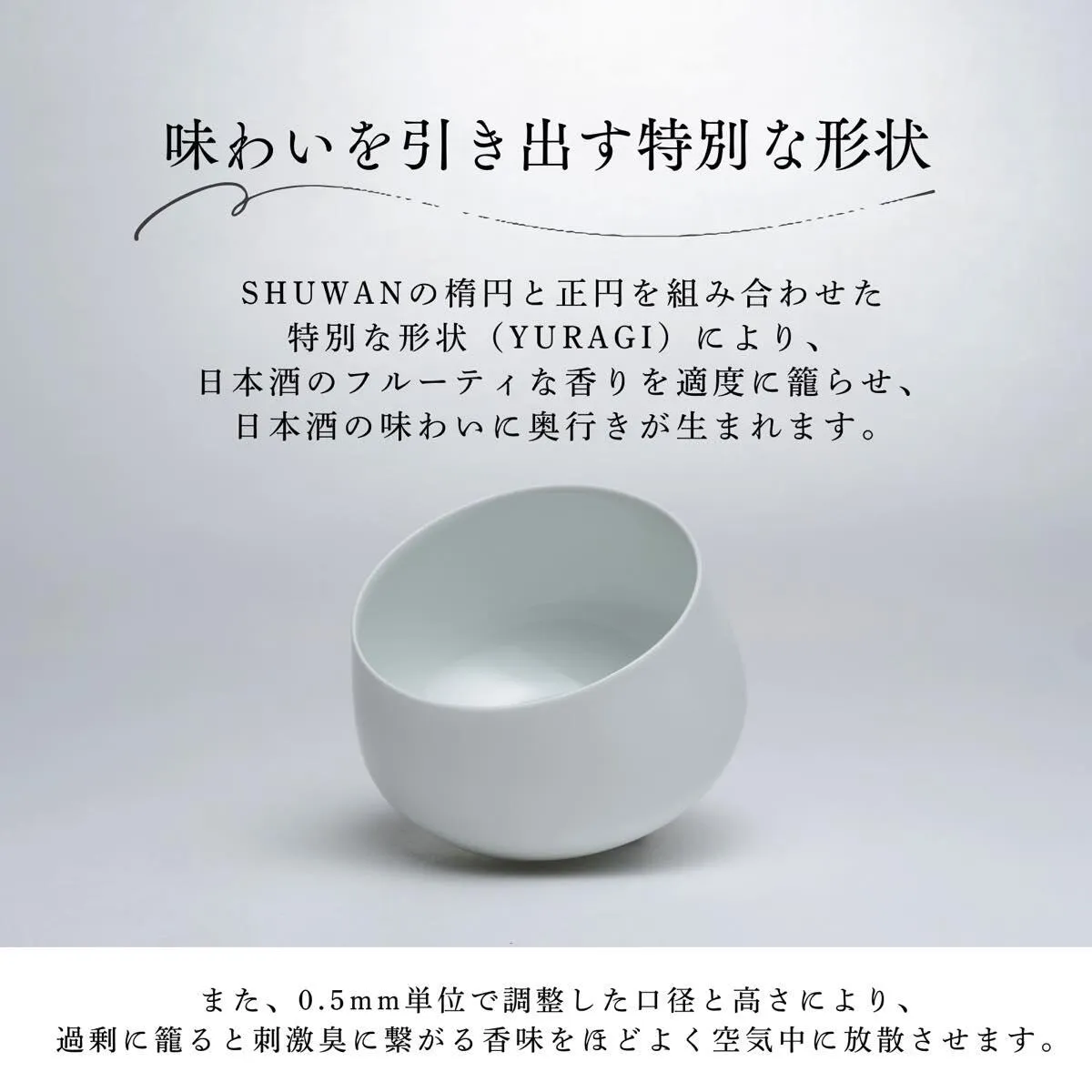 日本酒を器の半分ほど(90~120cc)注ぐことで、香りと味わいが驚くほど調和し、お酒本来の美味しさを余すところなく堪能できます。楕円と正円を融合させた独自のフォルム「YURAGI」が、香りの広がりと味のふくらみを両立。口径と高さを5mm単位で調整することで、香りの籠りすぎによる刺激臭を適度に逃がし、香味バランスを最適に保ちます。
