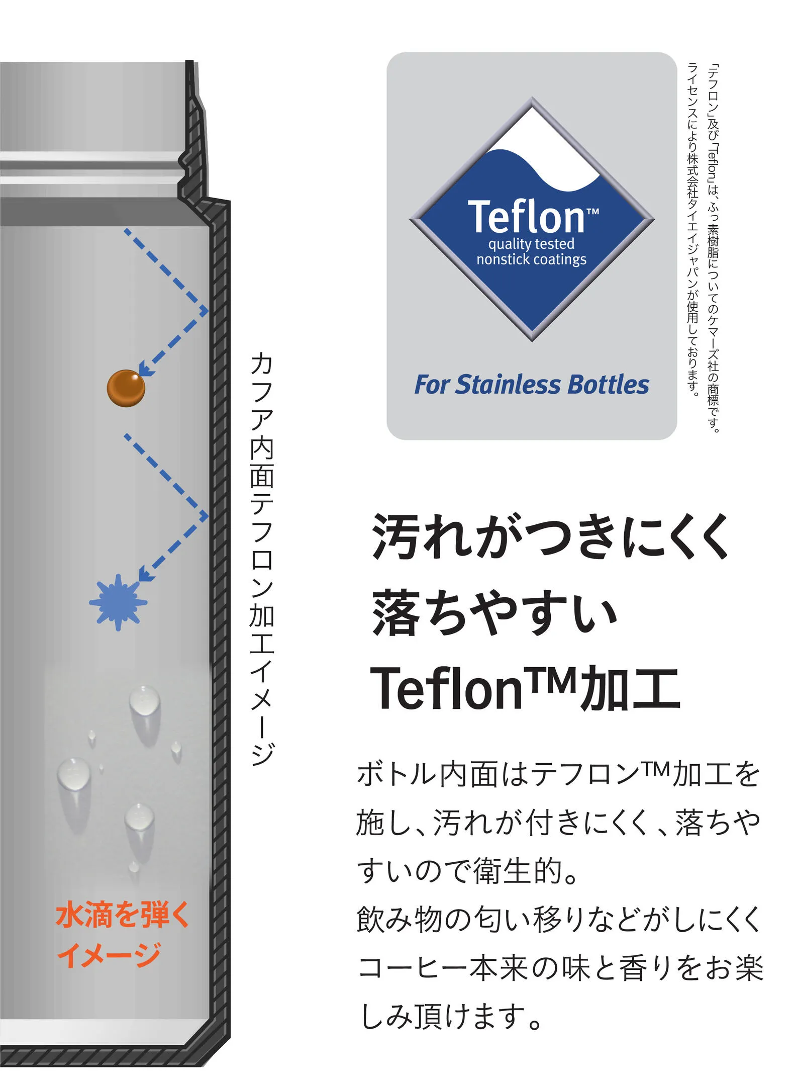 そこでフライパンの表面などに使われるテフロン加工をボトル内面に施すことでコーヒーの匂いや汚れがつきにくく、お手入れがしやすいコーヒーボトルが誕生しました。