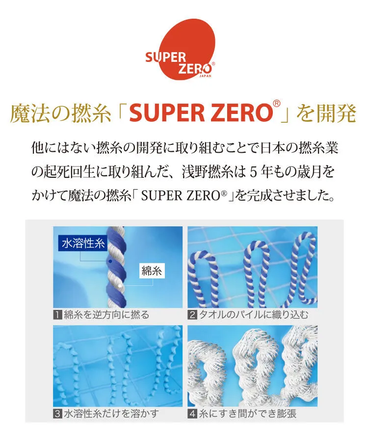 繊維の長い高級綿にスーパーZEROⓇ(特殊撚糸工法)を施すことにより、糸が膨らみ空気を含んだ事により、温かく通気性があり蒸れにくい製品が完成しました。