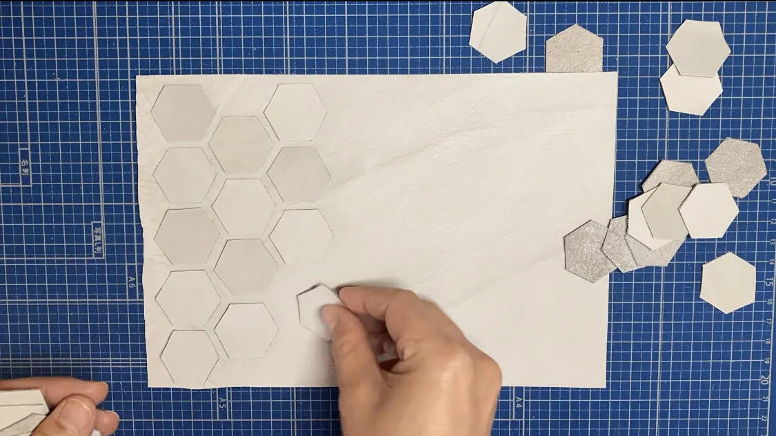 革は天然の素材ですので形も独特ですし、場所によって穴が空いていたり質感にムラがあったりと使い難い部分も多いものです。その為、作品の型をカットすると微妙な形の端切れが沢山出てしまい勿体無いなと常々思っておりました。そこから余った端切れを更に小さくカットしそれを模様になるよう並べて縫い付けるという方法が生まれました。