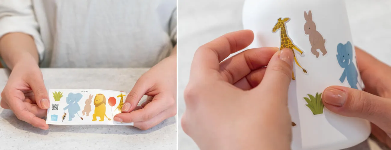 上手く貼れなくても大丈夫。特殊加工のシールだから貼り直せます。耐水性だから石けん、水濡れOK。幼稚園や保育園にもおすすめ。