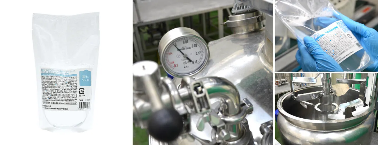 私たち石けんワークスのハンドソープは、洗浄成分 ” 100%純石けん " でできています。また、この商品を作る私たちも、 ” 純度100% ” の石けんユーザーです。 石けんを日々使い、石けんの良いところ苦手なところを知り尽くしたメンバーで石けんワークスはできています。 どこでも、いつでも、だれでも、手を洗うたびに「happy !」になる。そんなハンドソープ、「洗う」の未来を、私たち石けんワークスは目指しています。 ※ 石けんワークスは 株式会社switch の登録商標です