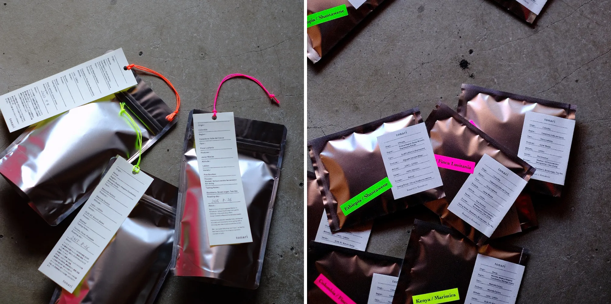 隣(tonari)で取り扱うコーヒーは、基本的には業界で設定されている**「トップスペシャルティ」**という品質のものを基準に生豆を選定しています。私たち自身が味を確かめて納得できたコーヒーを選び、生産背景や物語、つくり手のこだわりをできる限り理解するよう努めながら、その味わいをできる限り豊かに表現できるように焙煎を心がけています。