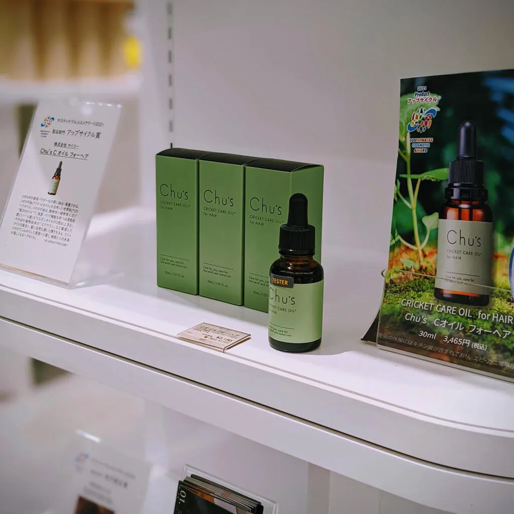 「Chu’s CRICKET CARE OIL for HAIR」は「サスティナブルコスメアワード2021」アップサイクル賞を受賞し、昆虫食の世界的リーディングカンパニーJR UNIQUE FOODSによって“世界初” と認められたコオロギ油活用の〈へアオイル〉です。