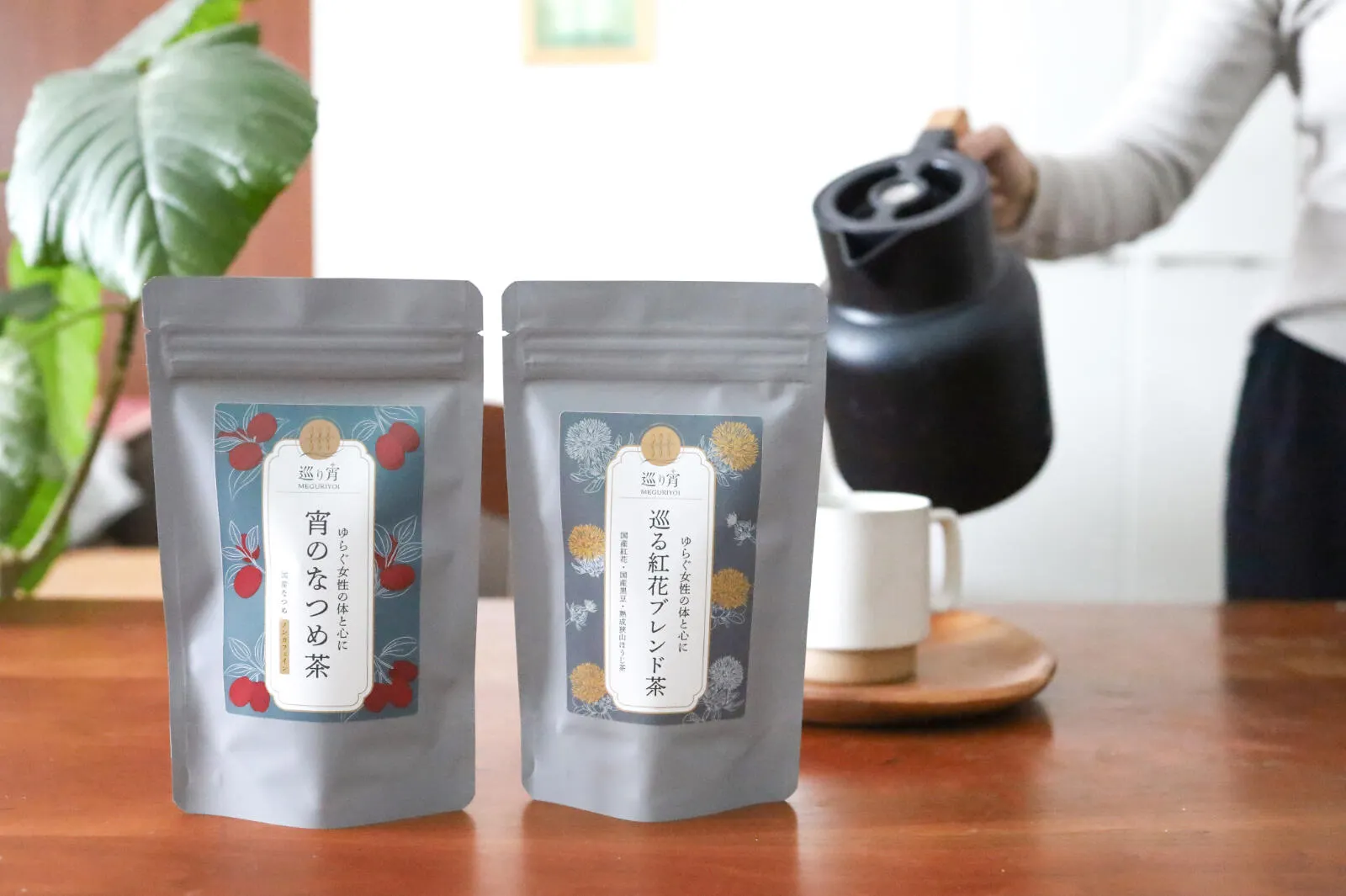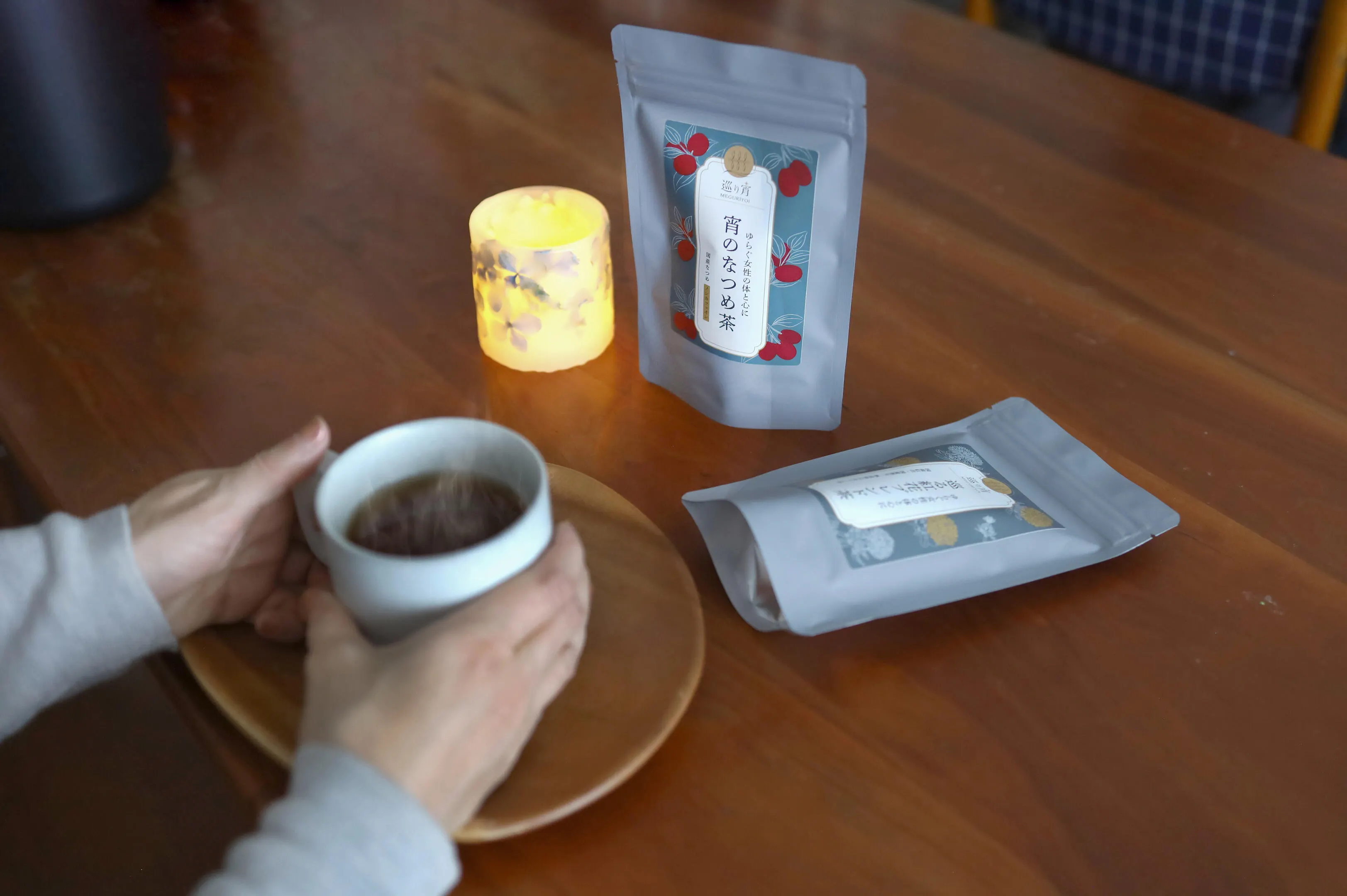 巡り宵は、40代前後からの冷えや心身のゆらぎに寄り添う温活茶ブランドです。忙しい毎日に、お茶で一息つけるような時間を提供します。