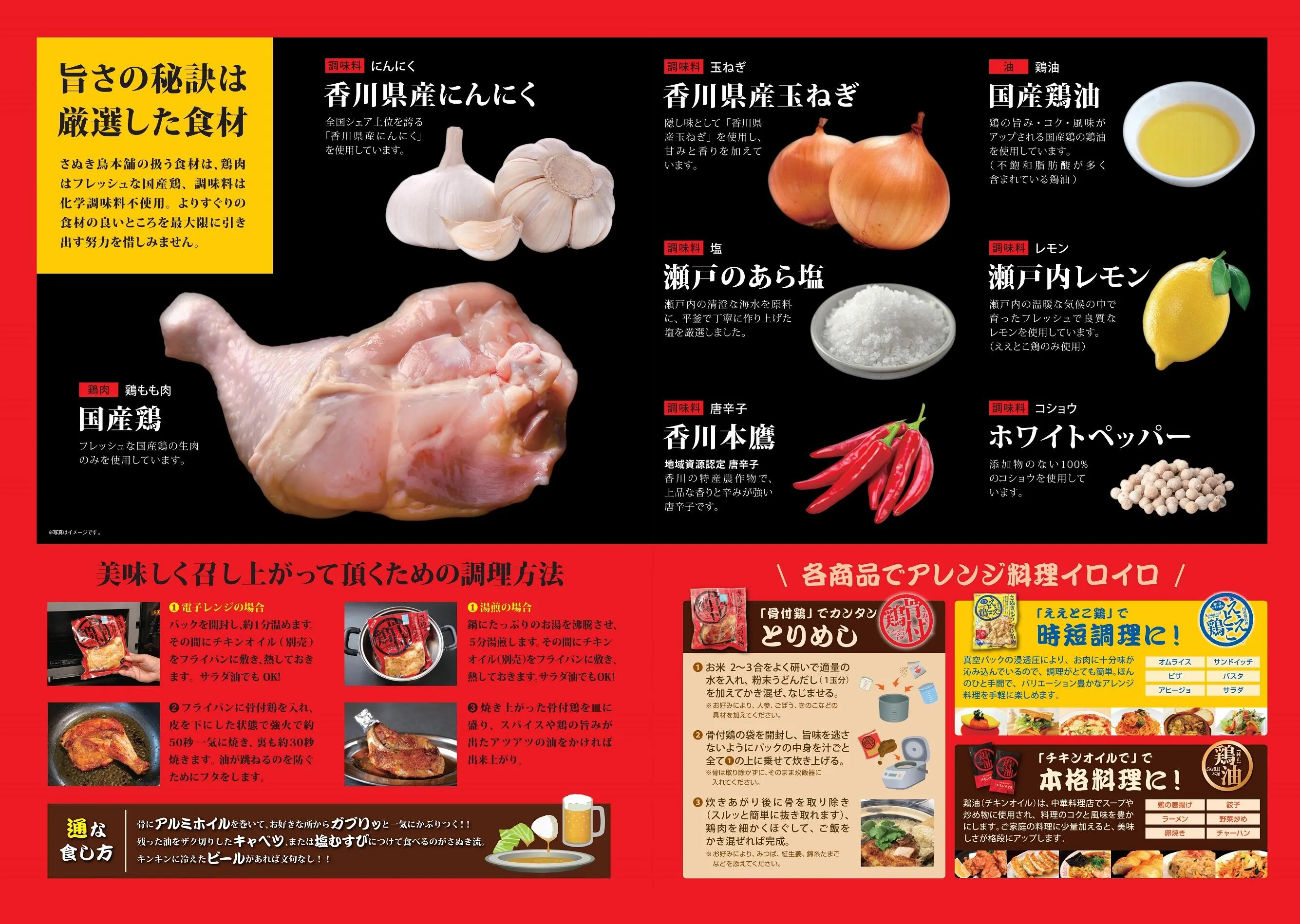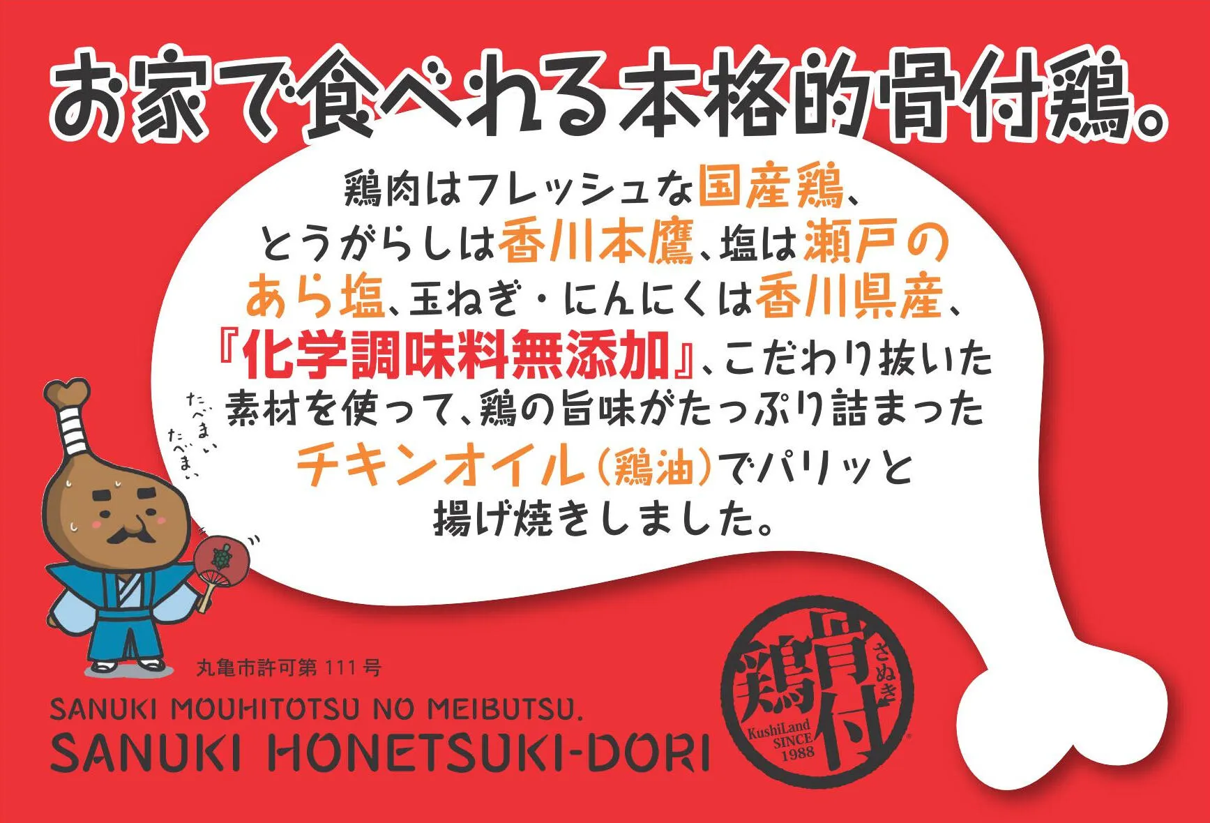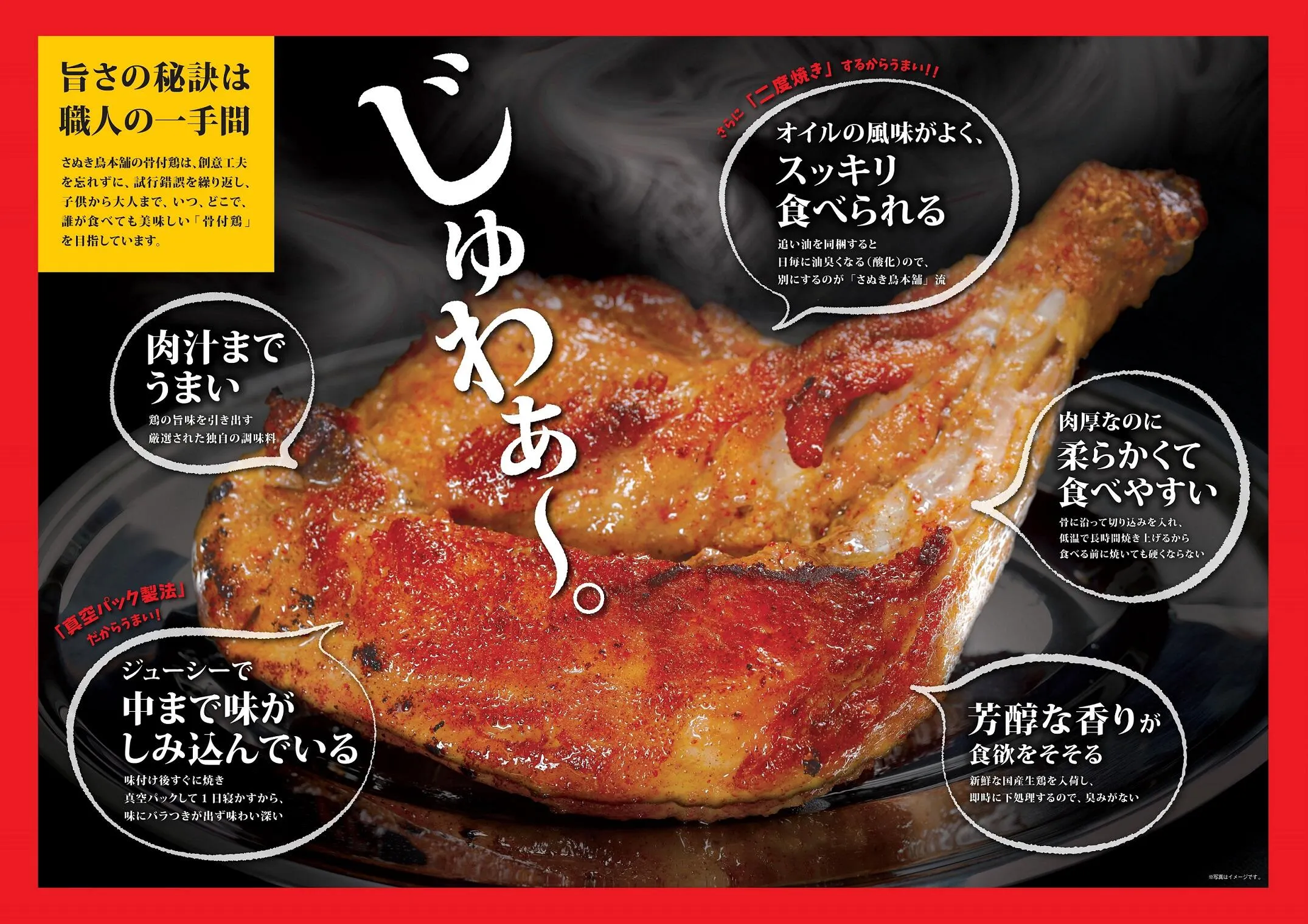 香川県にて焼鳥や骨付鶏を中心とした居酒屋を営んでいましたが、 店内で人気だった香川県の郷土料理【骨付鶏】を真空パックで販売すると、味もしっかりと染み込み、お客様にも大好評だったので、時代の流れとともに、事業形態も飲食店から骨付鶏製造販売業として【さぬき骨付鶏】の販売開始となりました。
