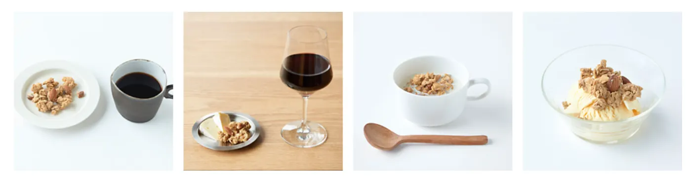 ふんわり、とか、やわらかーい、とか、ほろっほろ、とかって、食べ物の“ほめことば”として使われることが多いですが、このナッツグラノーラは、そんな感じではありません。オート麦やナッツ、食物繊維を混ぜ合わせてしっかりと焼いて、歯ごたえのある食感にしています。ギュッ、ギュッと噛みしめると、中から素材の甘味がジワッと染み出てきます。