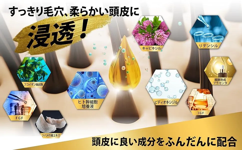 更に、9種の育毛成分(キャピキシル、リデンシル、ミノキシジル誘導体、ヒト幹細胞培養液、醗酵熟成プラセンタ、IGF、FGF、ツバメの巣エキス、フコイダン抽出物)を配合。