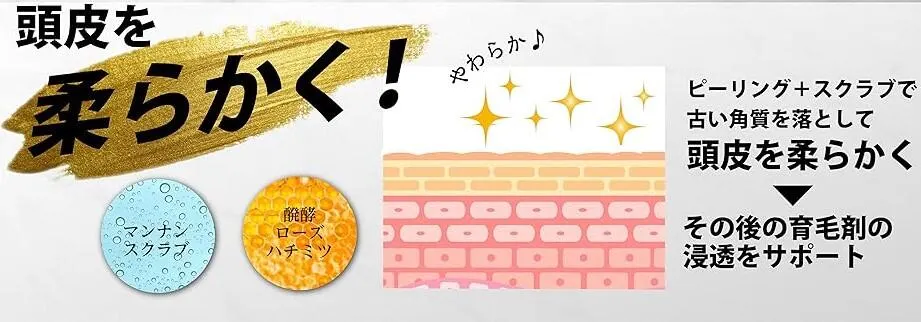 【2つのピーリングで柔らかく】 マンナンスクラブ、醗酵ローズはちみつによるマイルドピーリング効果で古い角質を優しく落とし、潤いある柔らかい頭皮へと導きます。