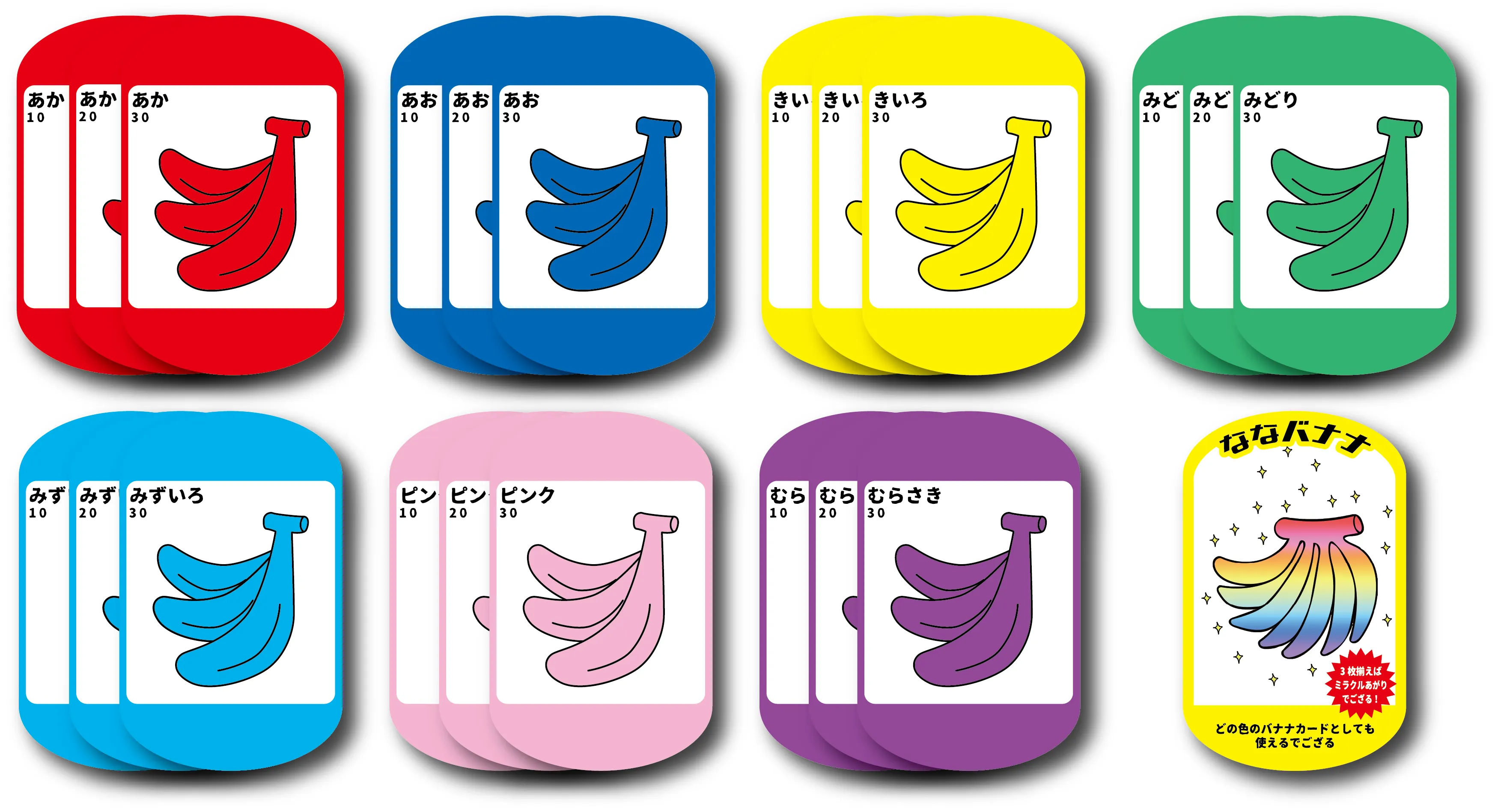 同じ色のバナナカードを7枚集めるゲームです。色の識別ができない子でも楽しく遊べるように、バナナの色を文字で記しました。点数をつける際、バナナが1本10点になっています。カード上部分には数字があり、遊びながら簡単な計算もできるようになっています。知育玩具としても活用できるでしょう。