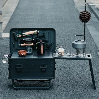 WAITER-U CONTAINERは、折りたたみ式アルミコンテナとして収納とテーブルの二役を担います。キャンプギアを整理整頓しながら、必要時にはサイドテーブルとして使用可能。コンパクトに折りたためるため、車載時の省スペース化も実現しています。
