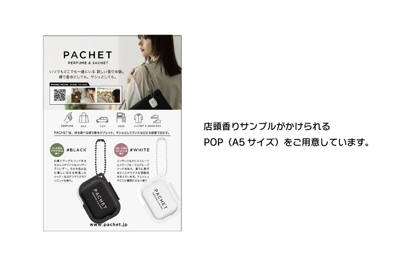 商品名の「PACHET」は、「Perfume」と「Sachet」を組み合わせて名付けたものです。