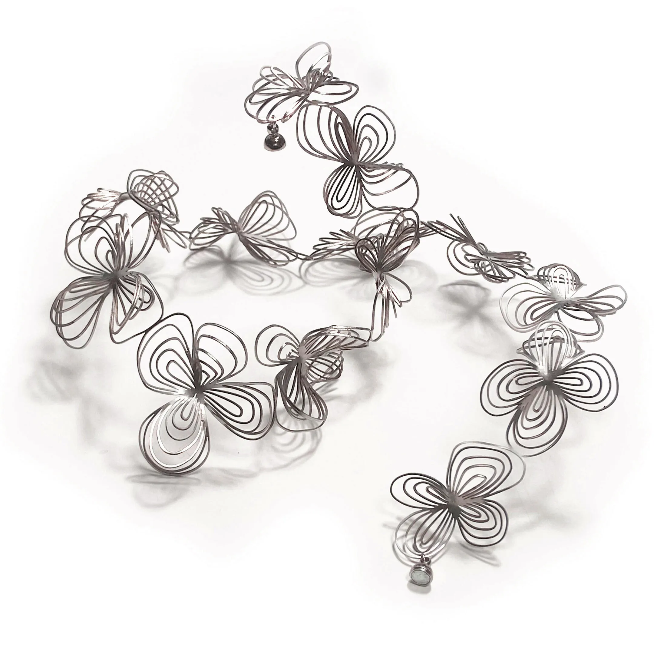 ジュエリーは軽量で着けているのを忘れてしまうくらいです。自由にかたちを変形させられるので、インテリアオブジェとしてもご家庭でご活用いただけます。FLOWER Necklace/BUBBLE Necklaceは花瓶に巻き付けるなど様々な使い方ができるので、インテリアショップなどでのお取り扱いもおススメです。