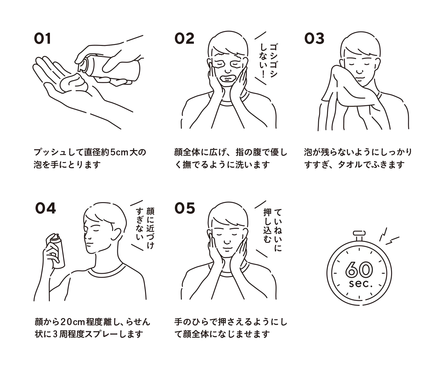 使い方はカンタン。洗顔の泡立ては不要で、化粧水が手からポタポタこぼれることもなく、顔にひと吹きするだけ。どんなに疲れていても、サっとスキンケアを完了できます。