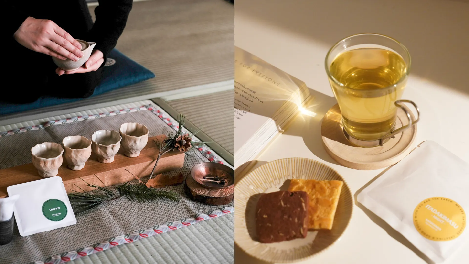 習慣設計×リジェネラティブ 里山素材を活かしたお茶を、朝・昼・夜のシーンに分けて飲む習慣とともに提案し、人と自然の循環を日常から育みます。