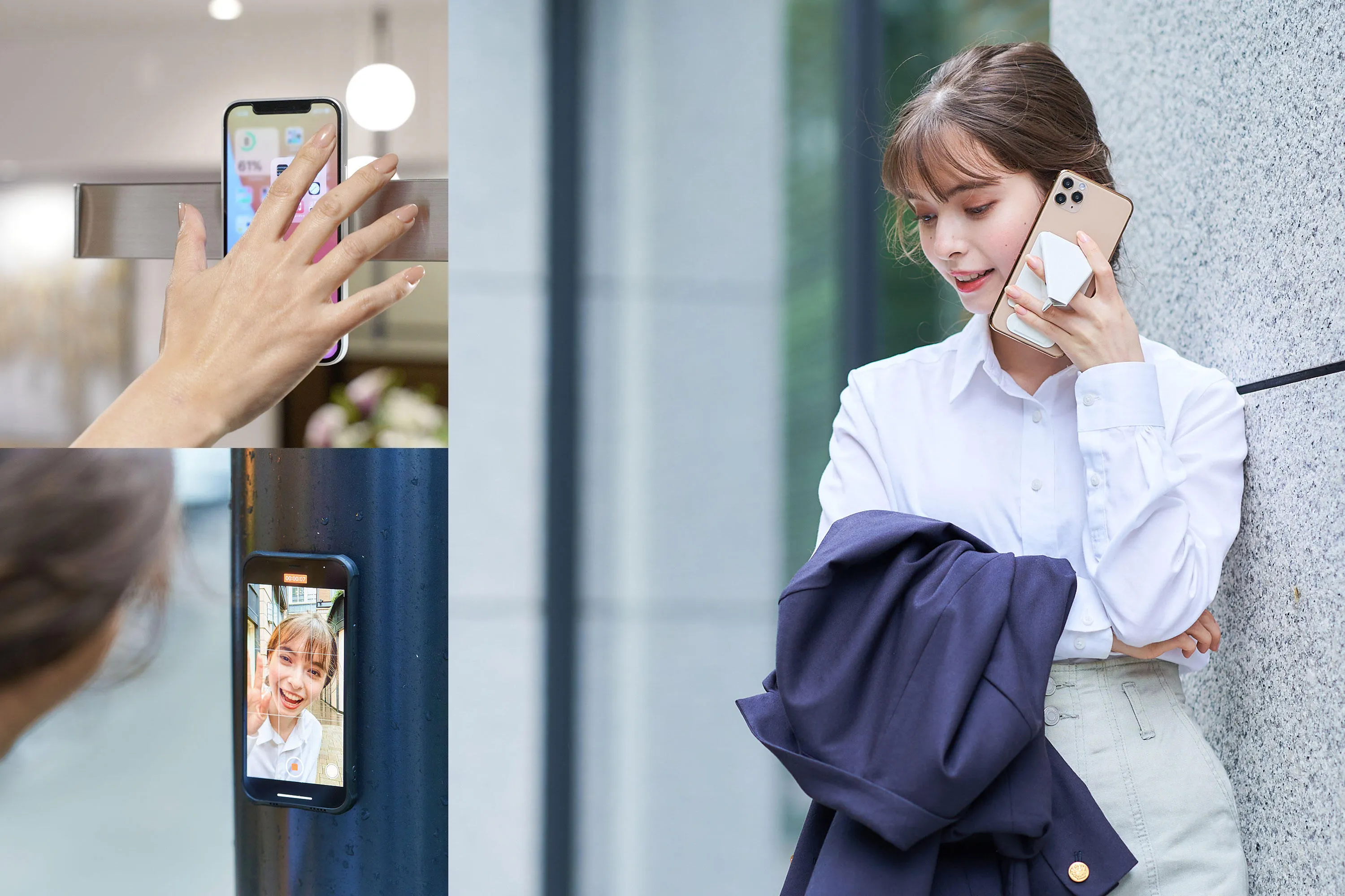 ③マグネット内蔵で「お風呂・冷蔵庫・ホワイトボード」に直貼りが可能。どこにでもスマホを張り付けられるので集合セルフィーも安全で快適に。