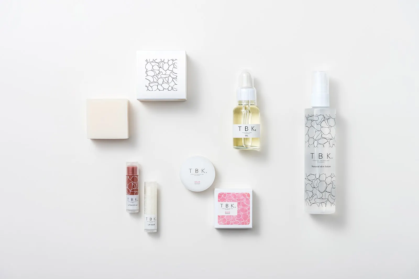 TBK cosmeの主成分となっている椿油(TBK 美容オイル)は、コールドプレス製法(非加熱処理)で搾油。原料となるこの椿油は、良質な椿の種のみを選別して使用し、搾油後の濾過は圧力をかけず自然落下で一滴、一滴、時間をかけて丁寧に行われています。また、搾油後の残渣(搾りかす)は、商品に使用するほか、肥料として椿が自生する林に戻し、余すところなく循環させ、地球にも、身体にも、お肌にも優しい化粧品です。