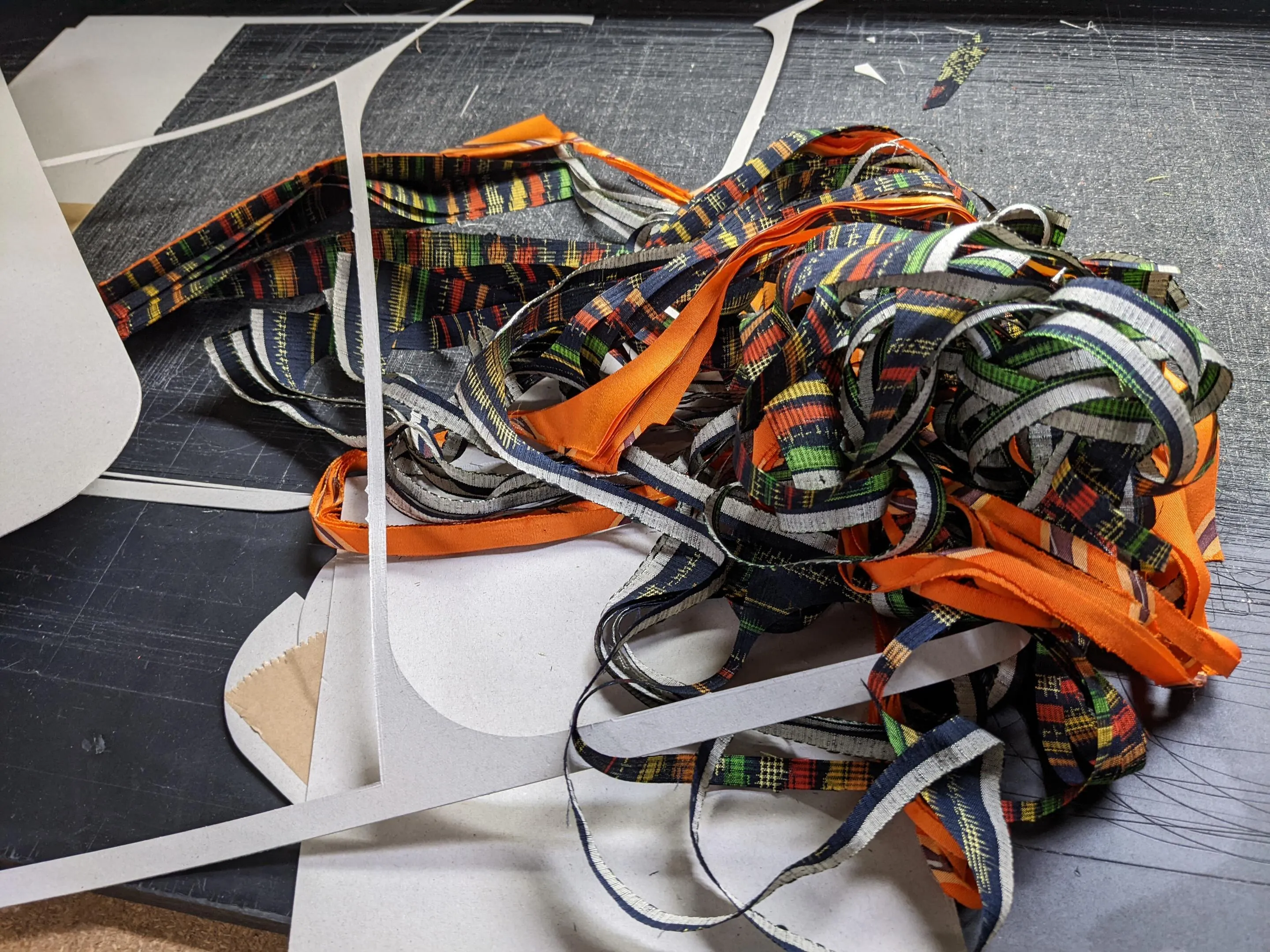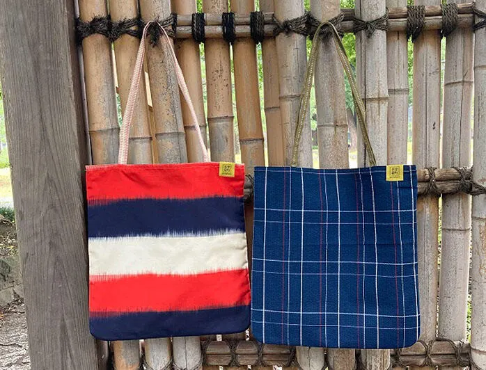 2.ユニークで大胆な反物のデザインを最大限活かしたバッグ作り