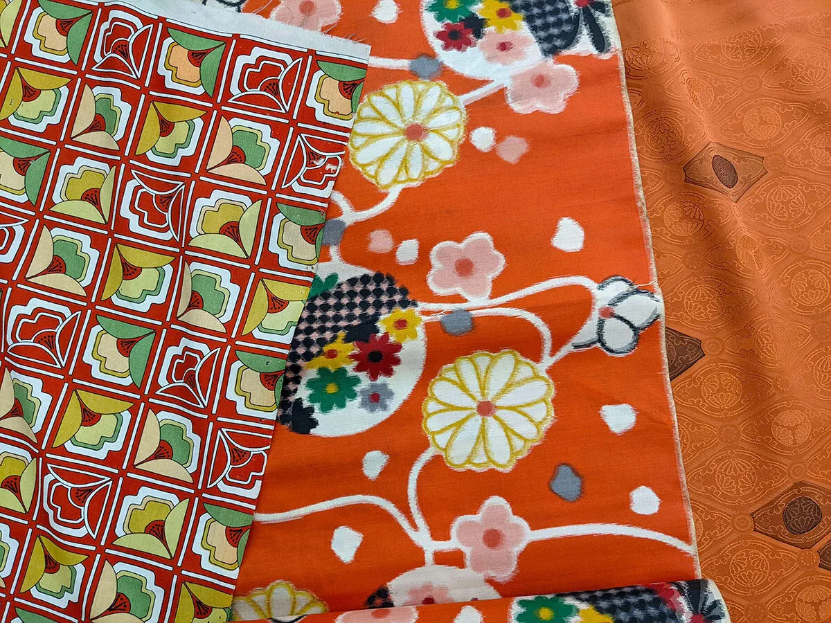 室町呉袋で使用する着物生地は、1970年〜2000年頃に作られた古い生地です。この時期に作られた反物は、ユニークで個性的な色味やデザインが特徴です。