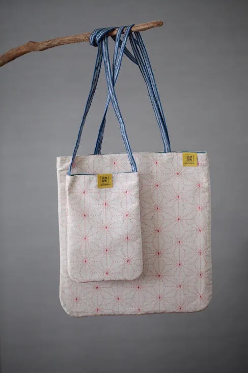 私たちは、最大限アンティーク着物生地を活用すべく、生地に余りを出さないよう裁断の仕方も工夫しています。例えば、ブランドスタート時から作り続けているトートバッグは、反物の幅をそのまま生かしたサイズ、またミニトートバッグは、反物幅から2つ分型取りできるよう工夫しました。