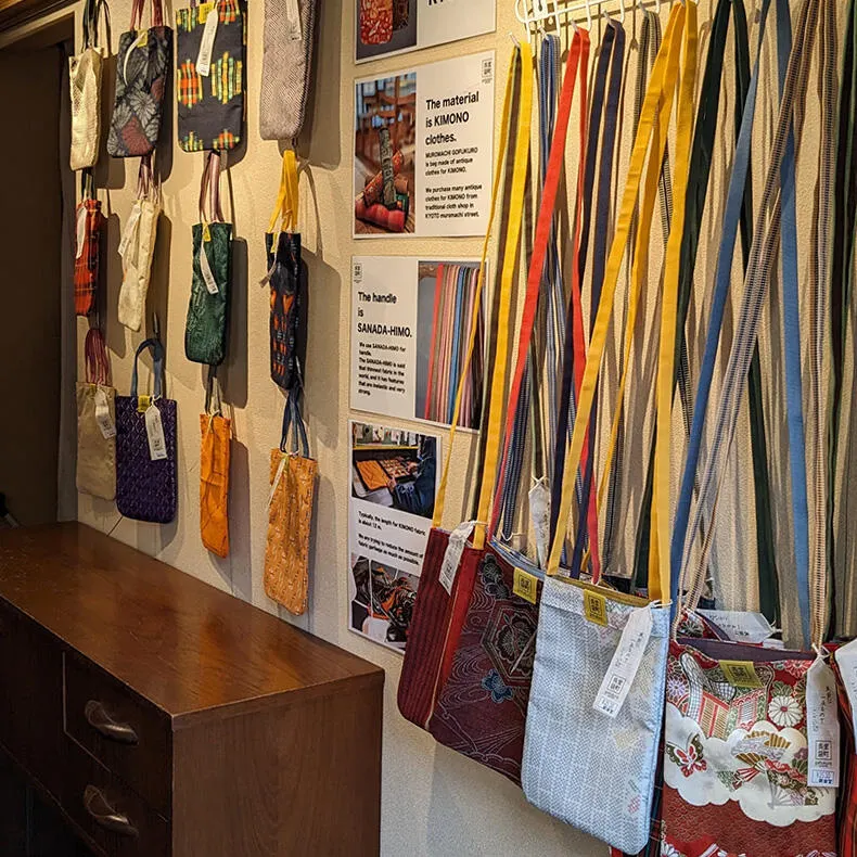 室町呉袋の素材は、大島紬、結城紬、黄八丈などの高級呉服生地をはじめ、浴衣用の生地、訪問着や羽織用の生地など多岐にわたります。さらに、袋帯や名古屋帯、最近では博多帯を使用したバッグの生産も始まっています。