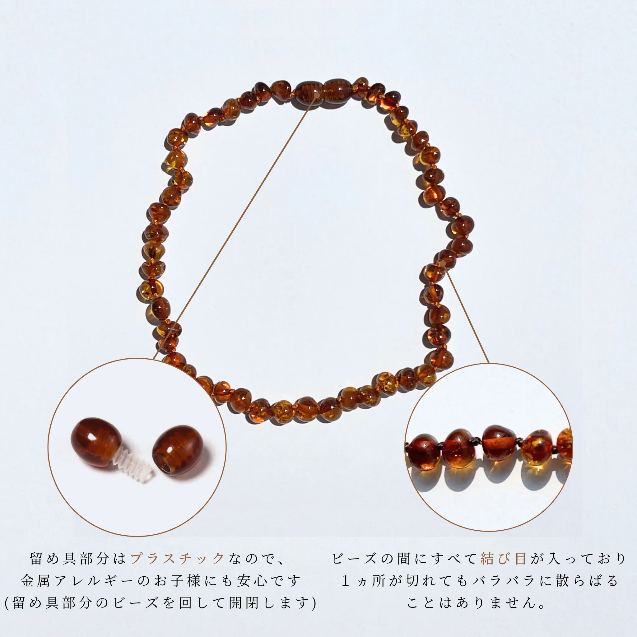 ベビー用アンバーネックレスは赤ちゃんの乳歯の萌生に伴う不快感や痛み、炎症を軽くするとして、